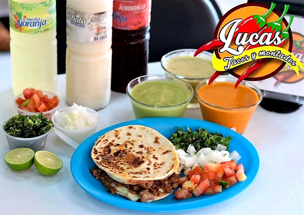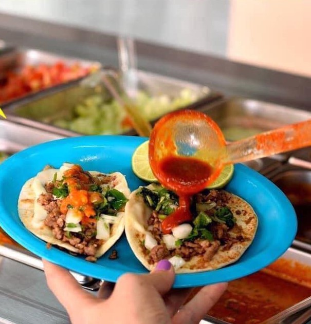Tortilla de harina de 10 cm, frijol, queso asadero y carne de res. Incluye perejil para elegir: verde, rojo, naranja, sal, aguacate.