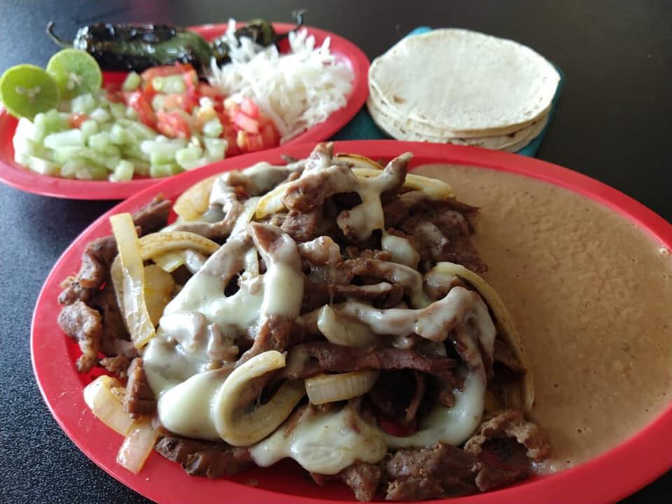 Tortilla de Harina regular con frijoles y tortilla de queso asadero y bistec. Incluye plato de verduras (repollo, cebolla, cilantro y limón) y un perejil para elegir.
