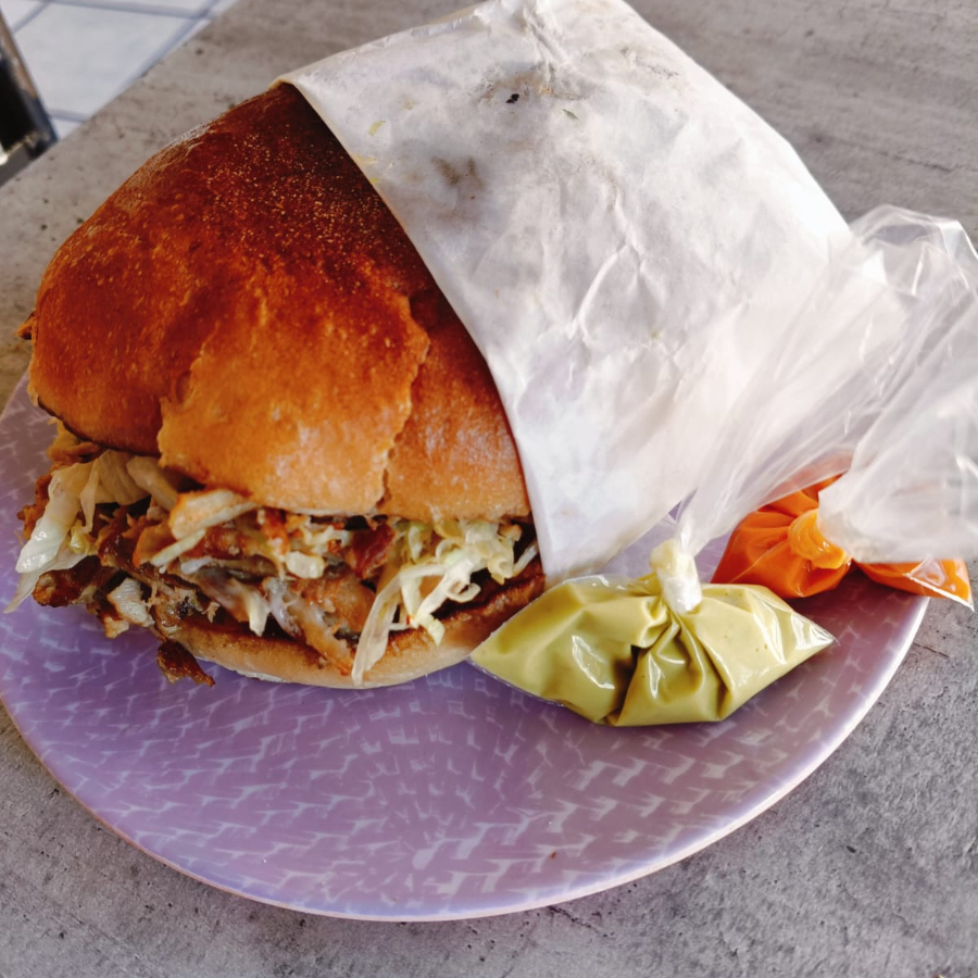 Torta rellena de carne al pastor, piña, jamón, queso y verdura.