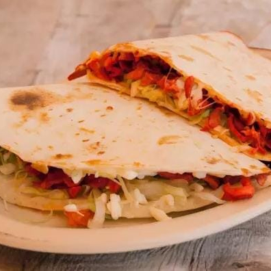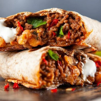 Burrito generoso con mezcla de carne, morrón, cebolla y queso.