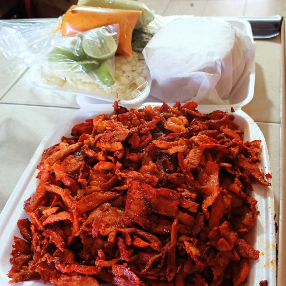 Carne al pastor con queso fundido encima. Incluye tortillas.