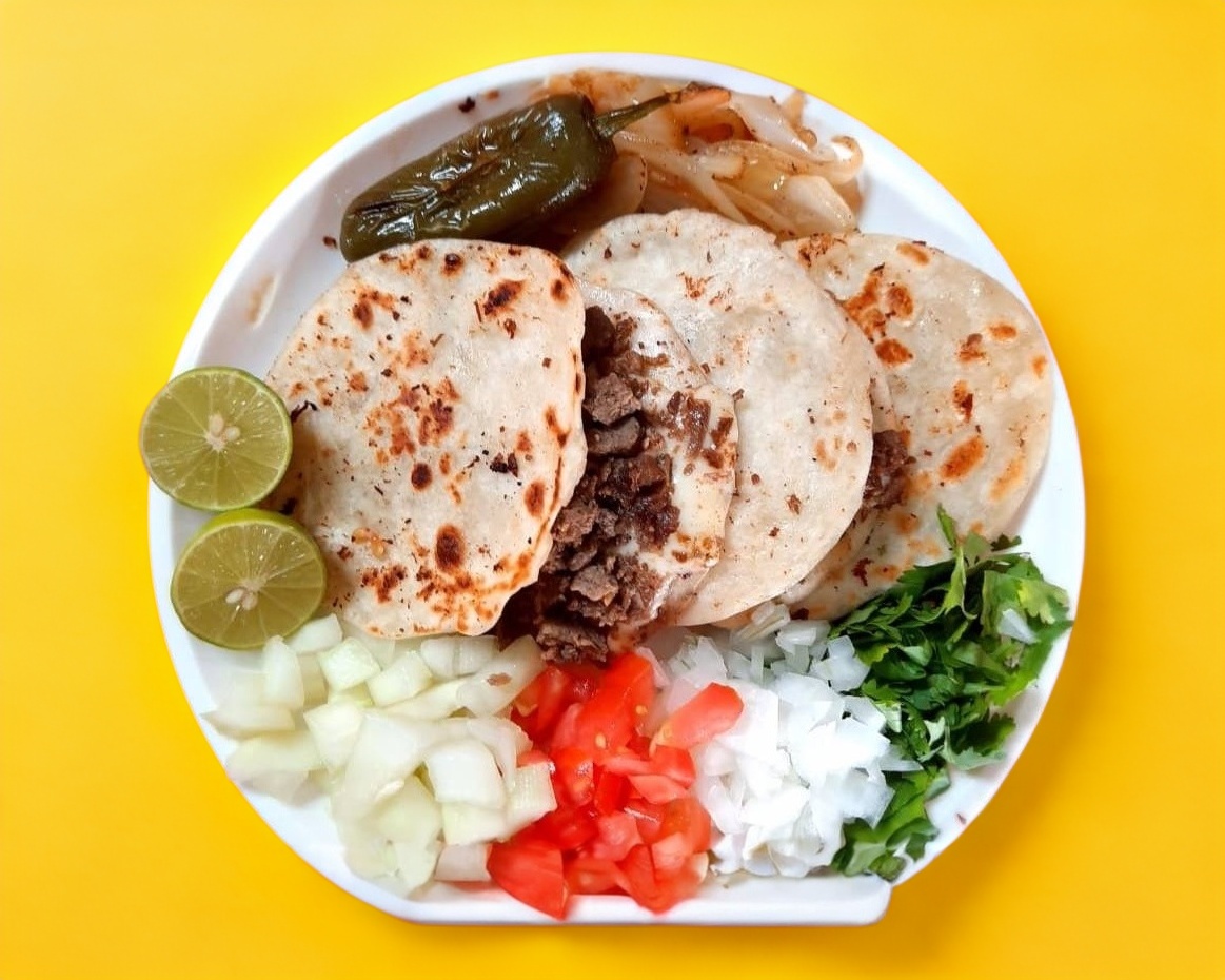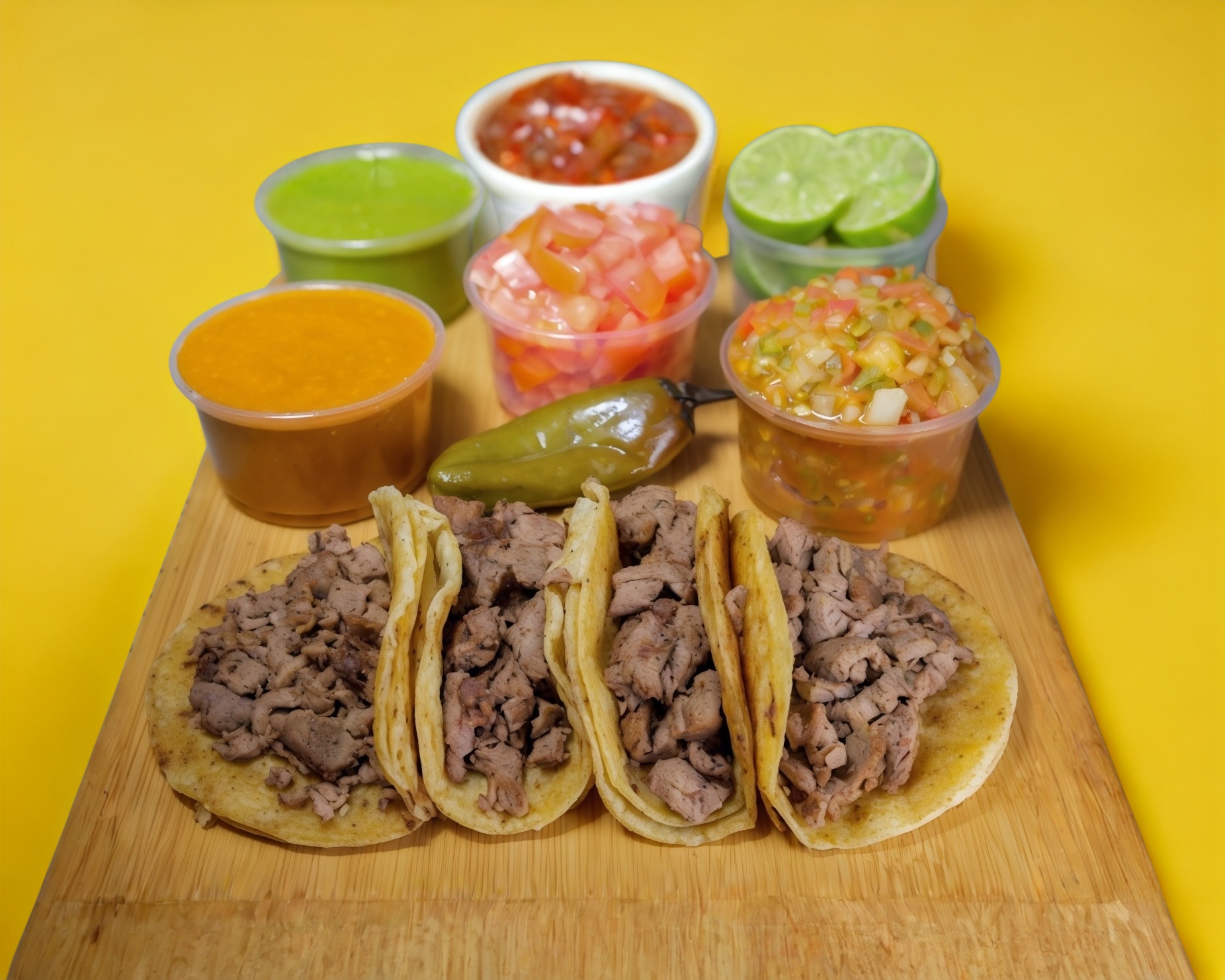 Deliciosos tacos de bistec preparado en su propio jugo (dos en tortilla de maíz y dos en tortilla de harina).