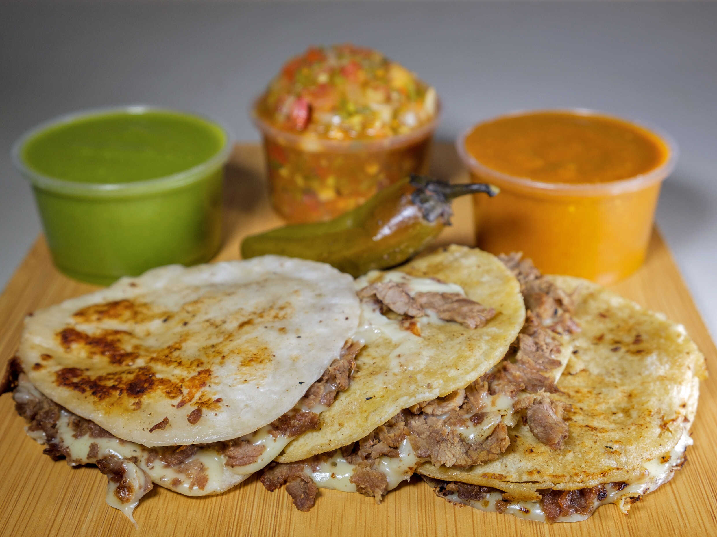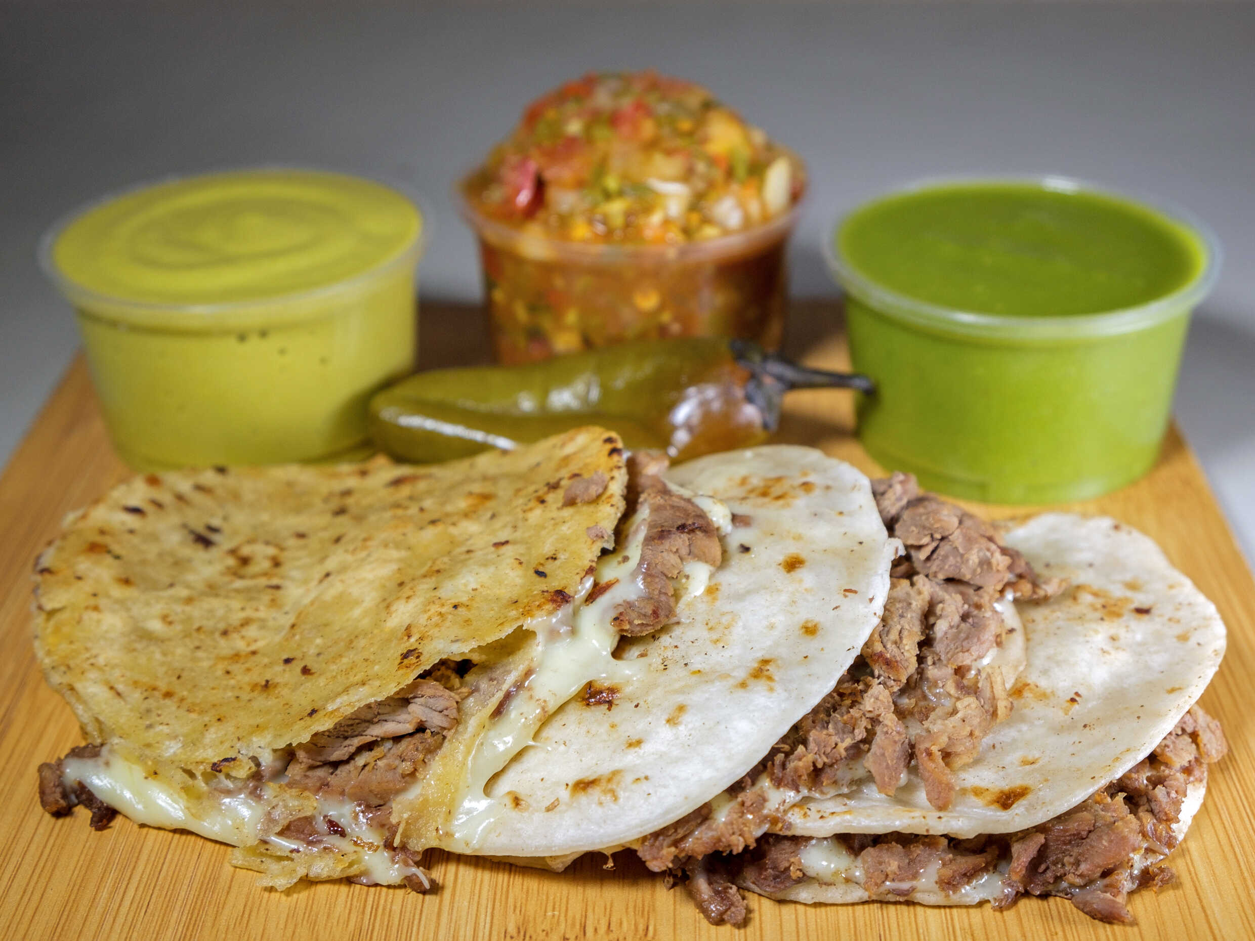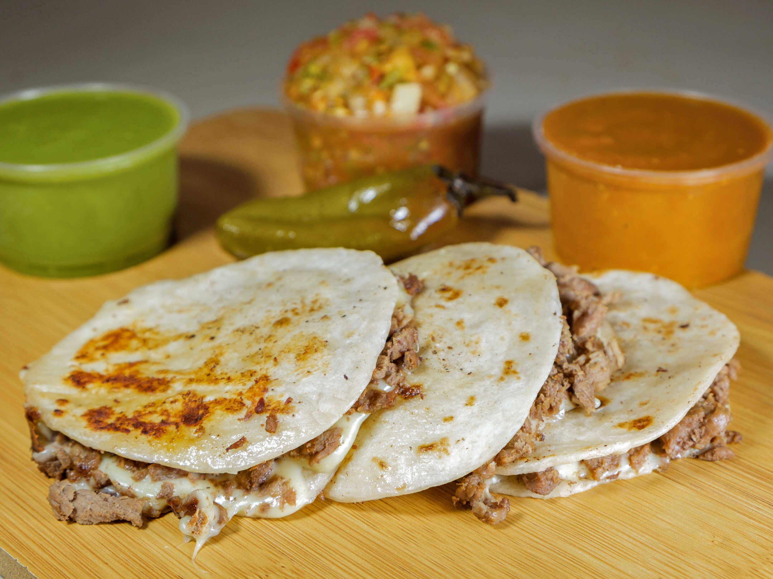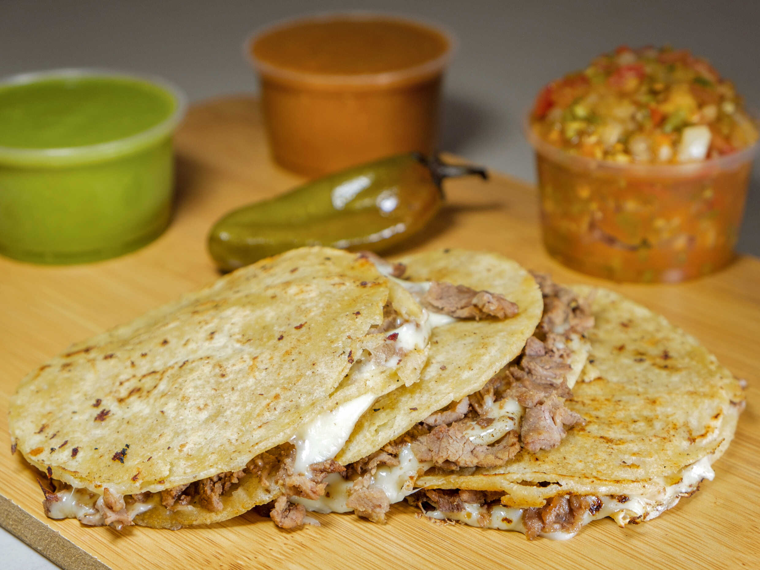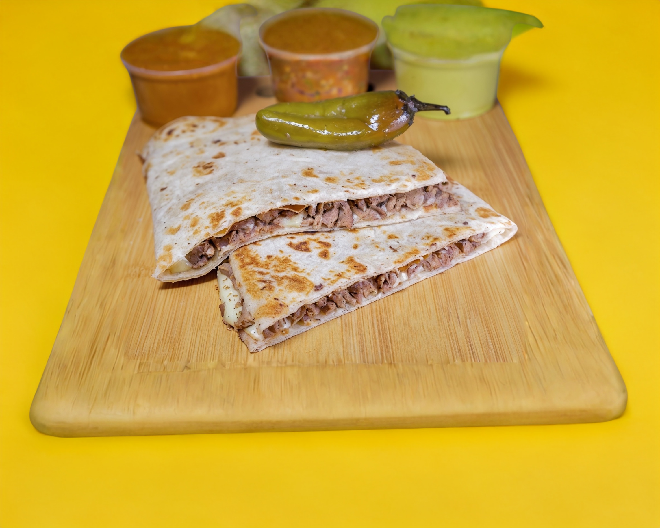 Tortilla de harina gigante doblada por la mitad, con frijolitos, asadero y el delicioso bistec de la casa.