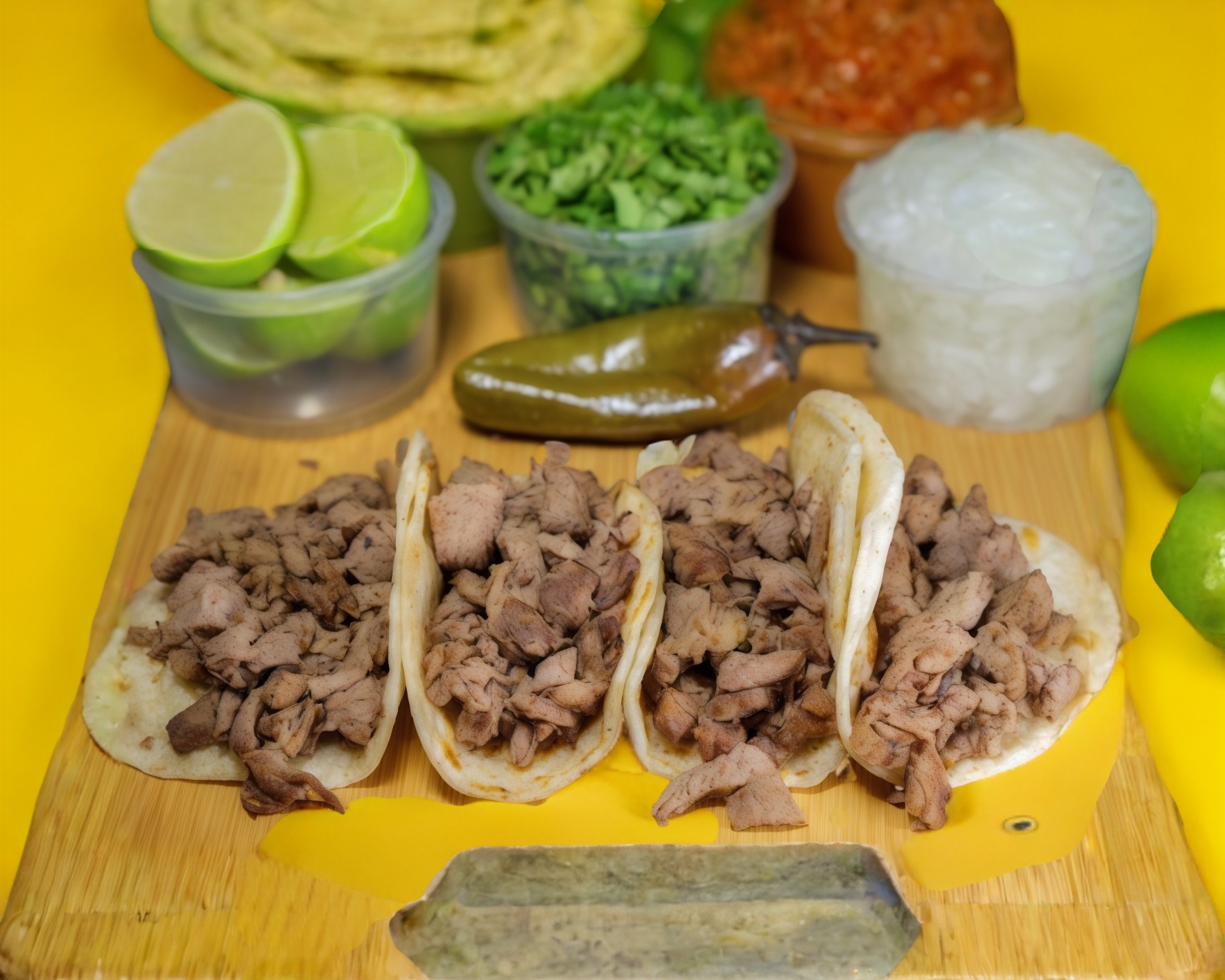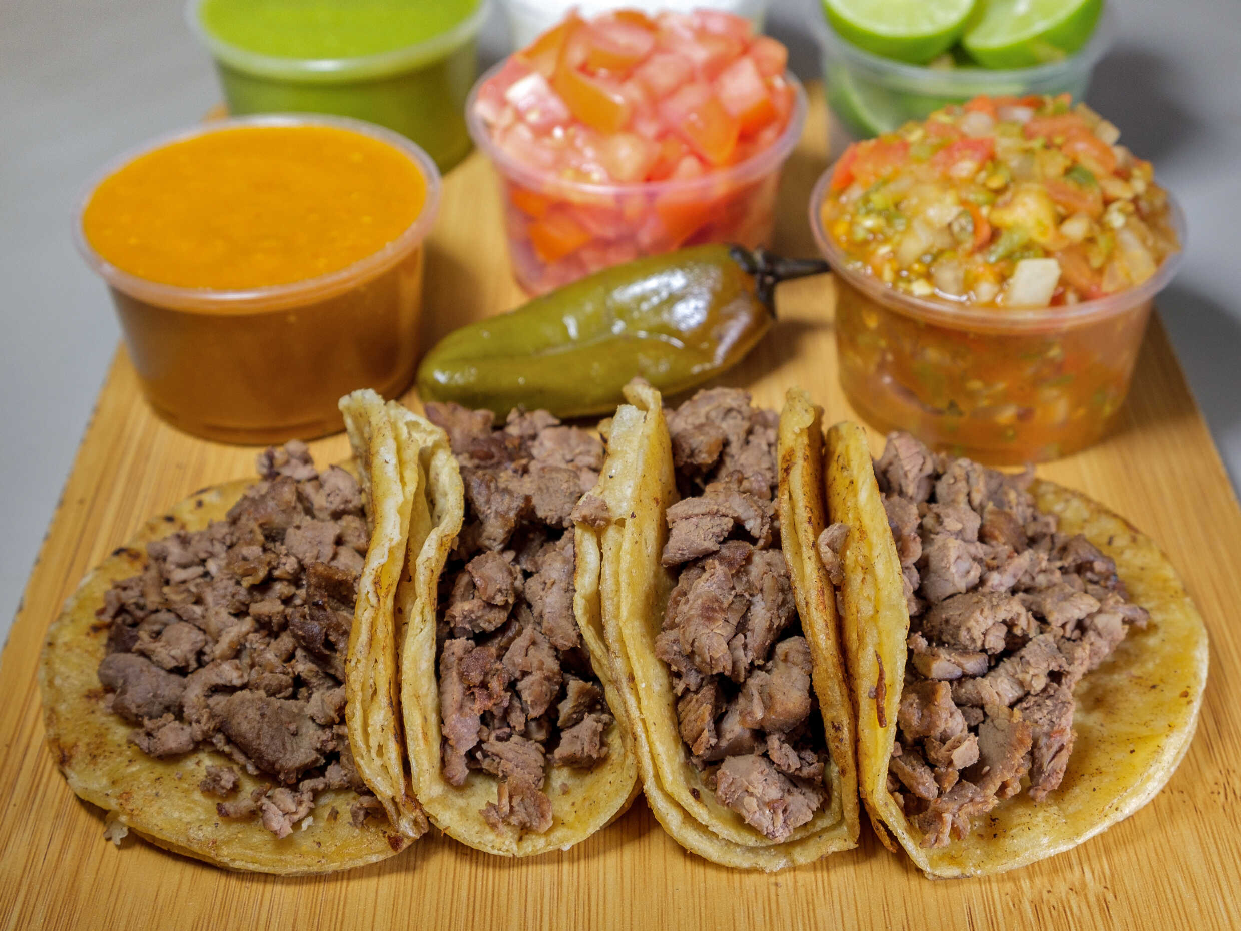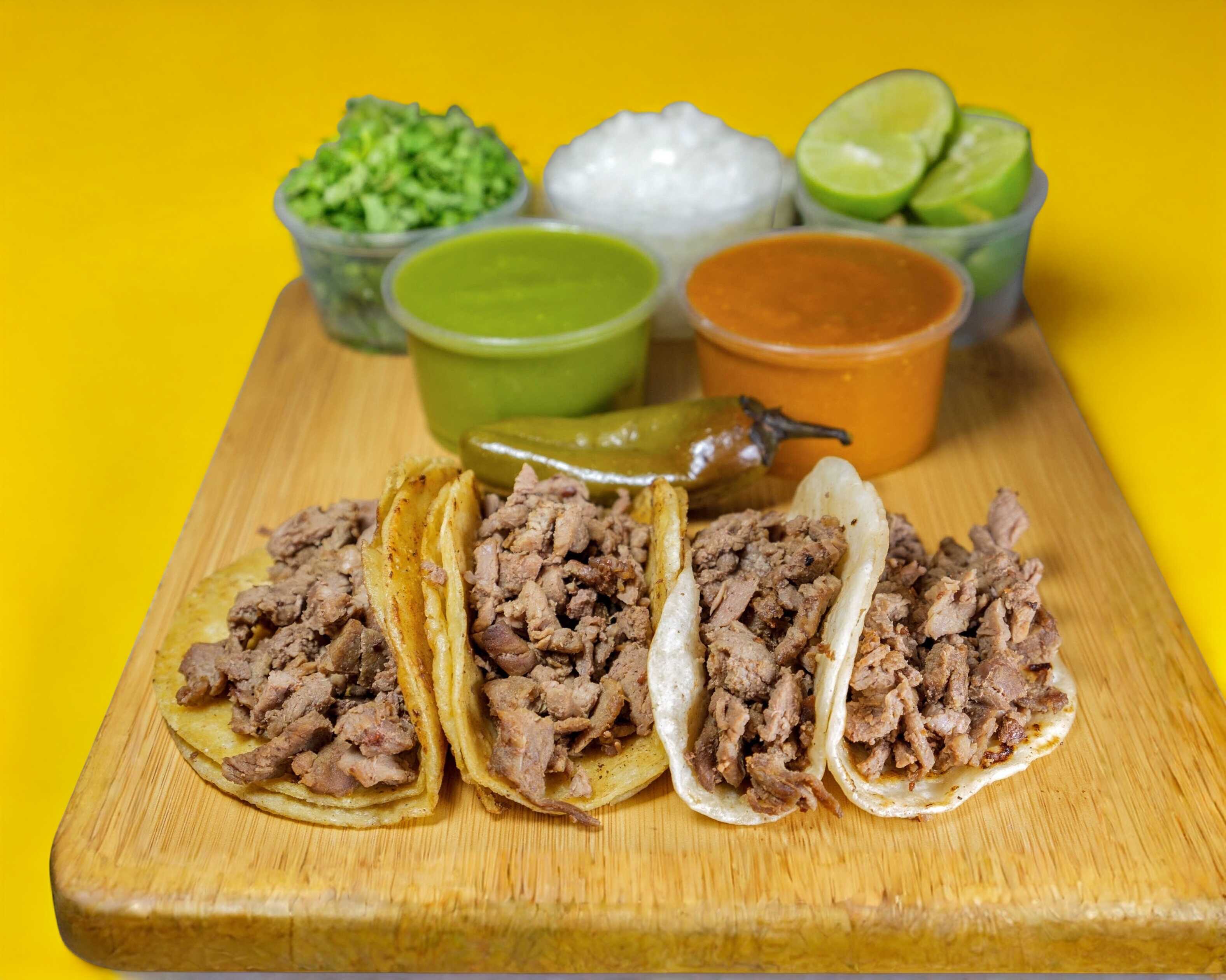 Deliciosos tacos de bistec preparado en su propio jugo en tortilla doble de maíz.