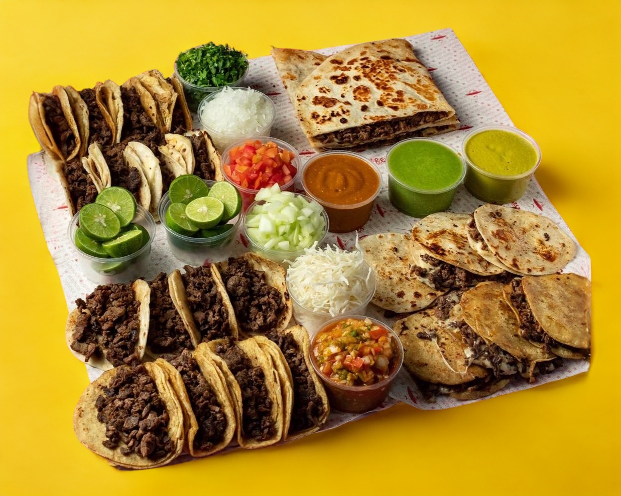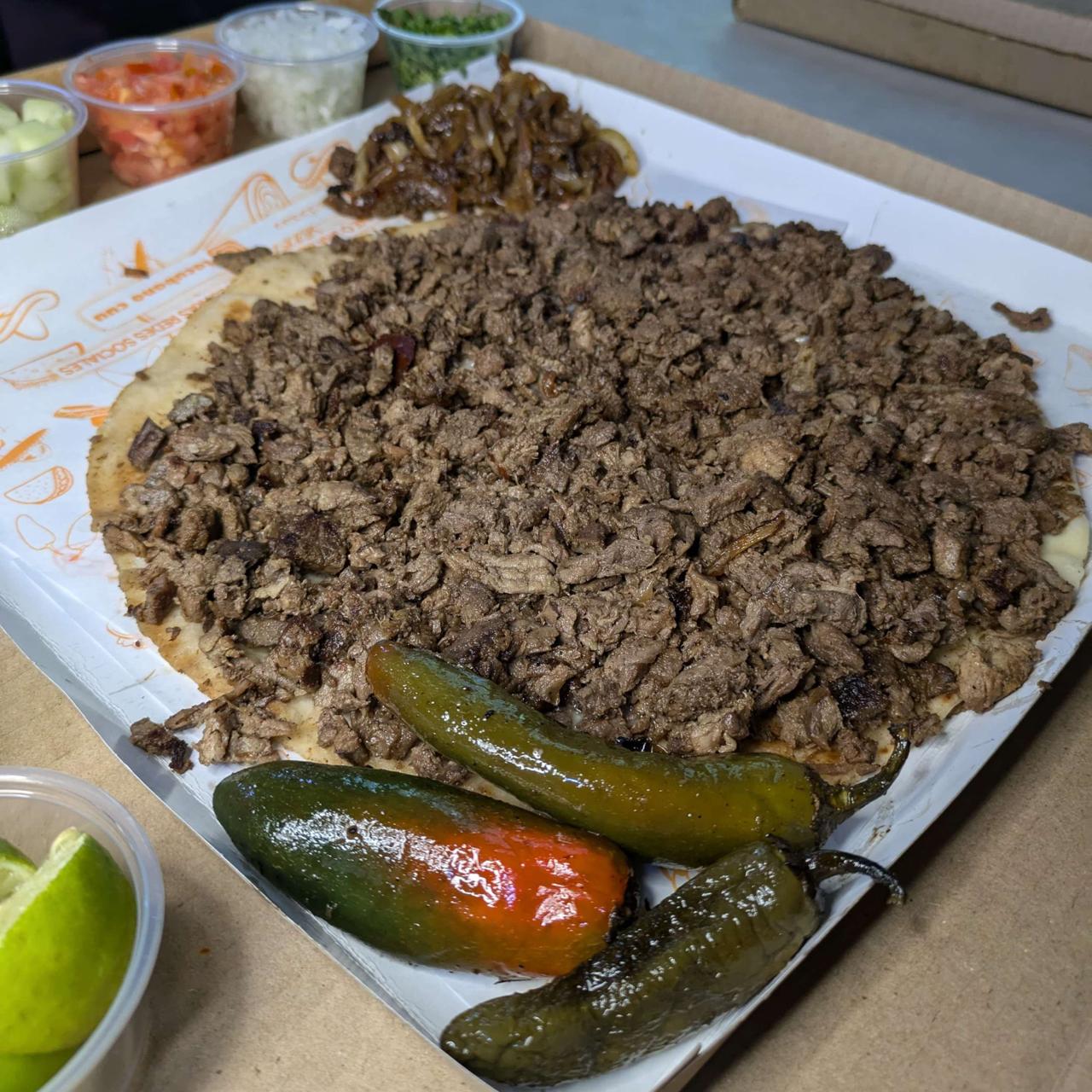 Tortilla de harina grande, doradita, con una generosa base de asadero y nuestro delicioso bistec de la casa (2 a 3 personas).