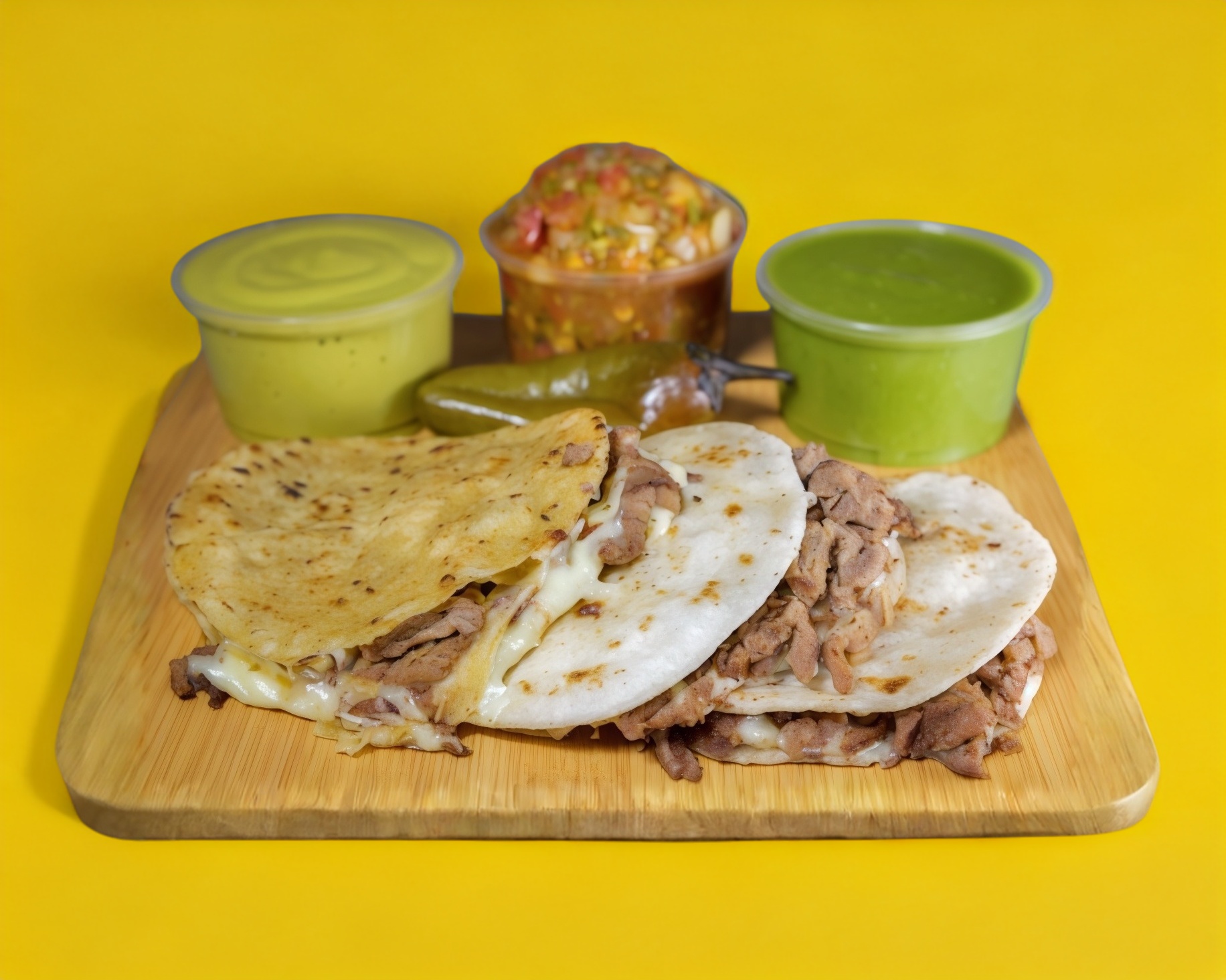 Tortilla con asadero seguida de delicioso bistec de la casa y por último otra tortilla encima (2 pzas maíz y 1 pzas harina).