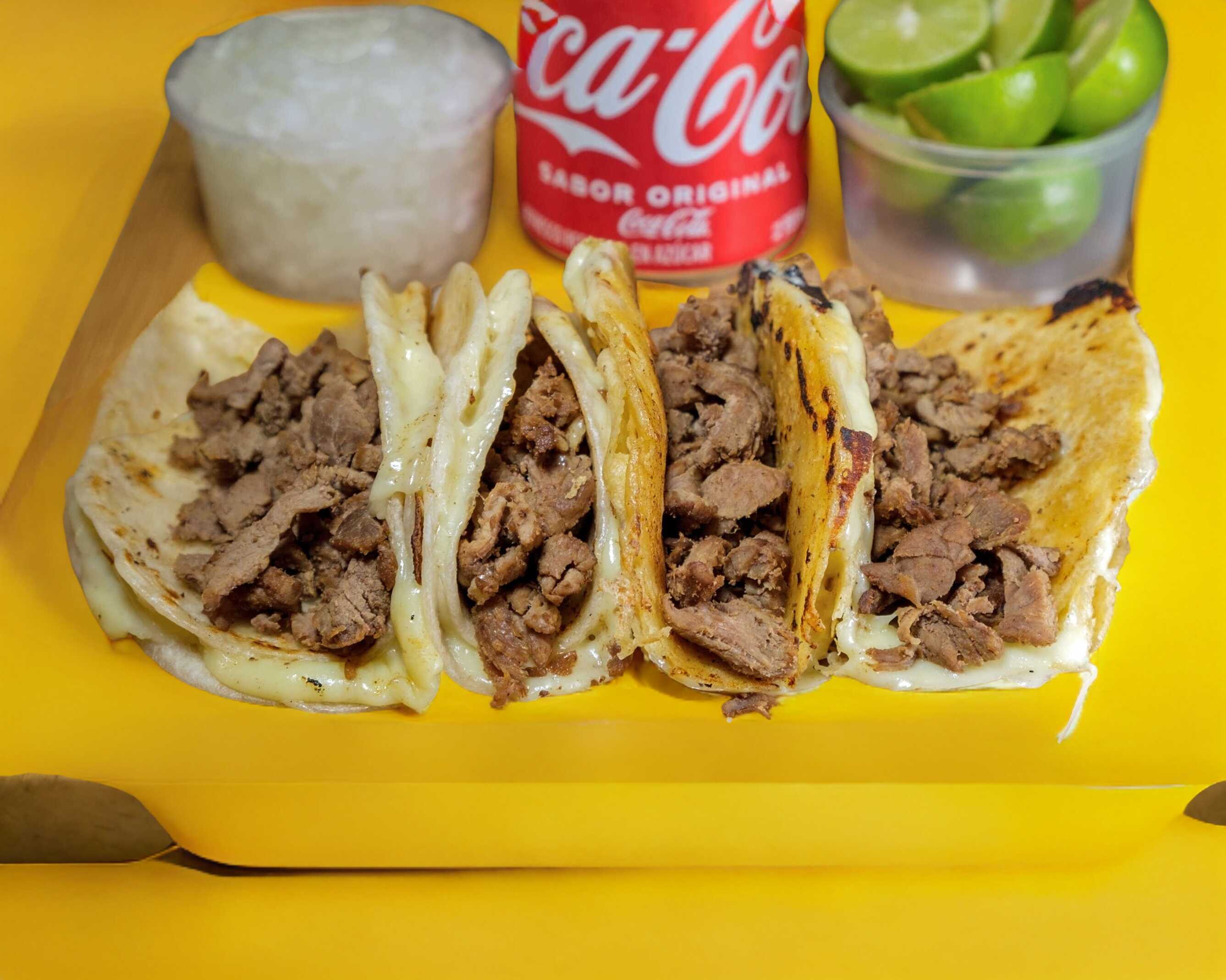 Deliciosos tacos de bistec en su jugo con asadero gratinado entre su doble tortilla.