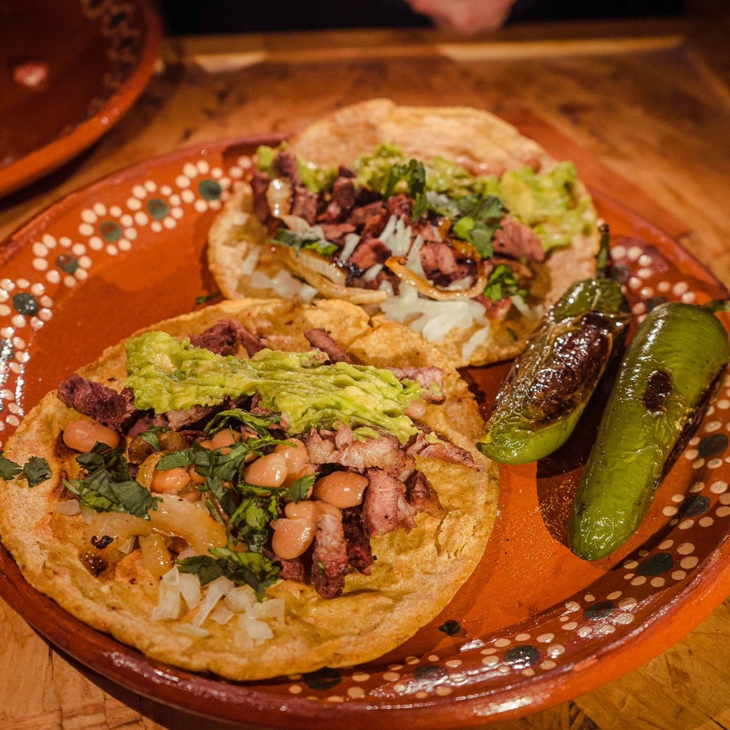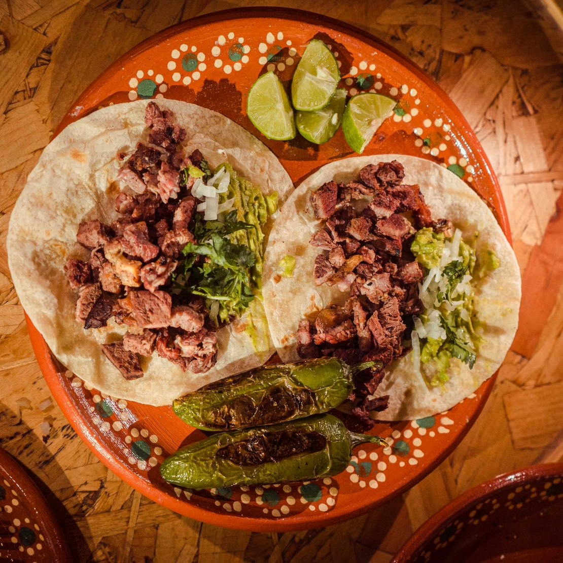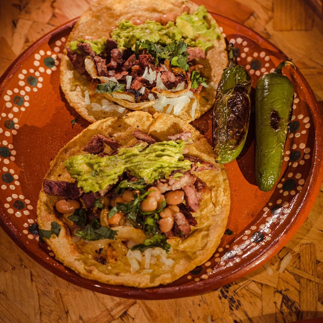 Tortilla hecha a mano, carne selecta asada al carbón, frijolitos de la olla, aguacate cebolla y cilantro