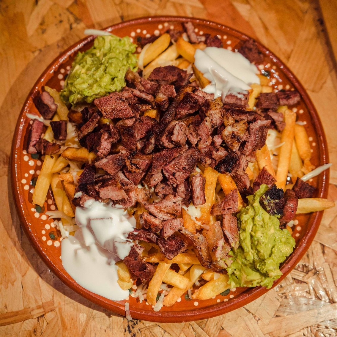 Papas fritas con queso gratinado, carne asada al carbón, aguacate y crema