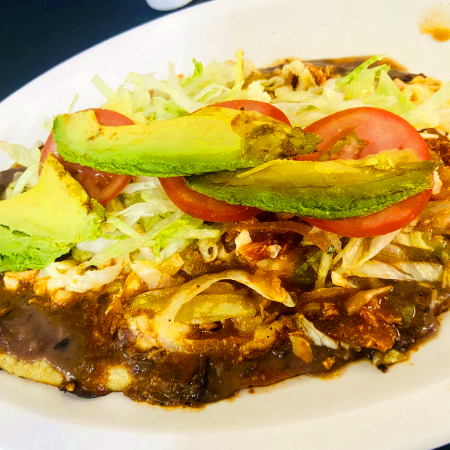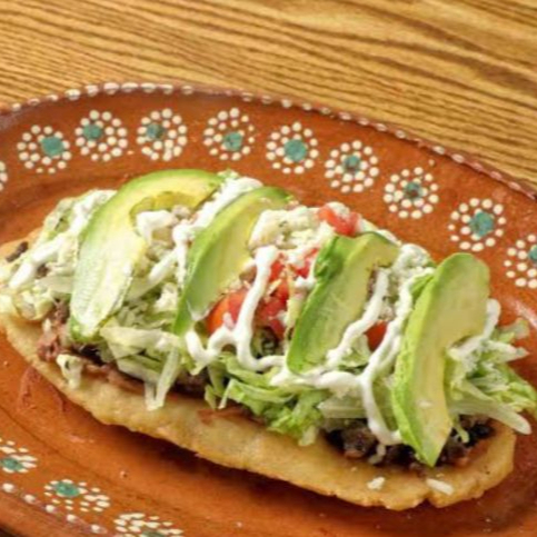 Tortilla frita de maiz ligeramente gruesa con frijoles carne de pastor se agrega queso gratinado verdura,lechuga, tomate y aguacate