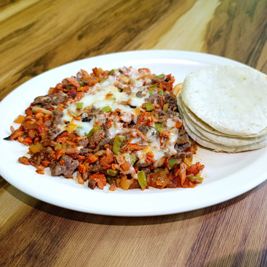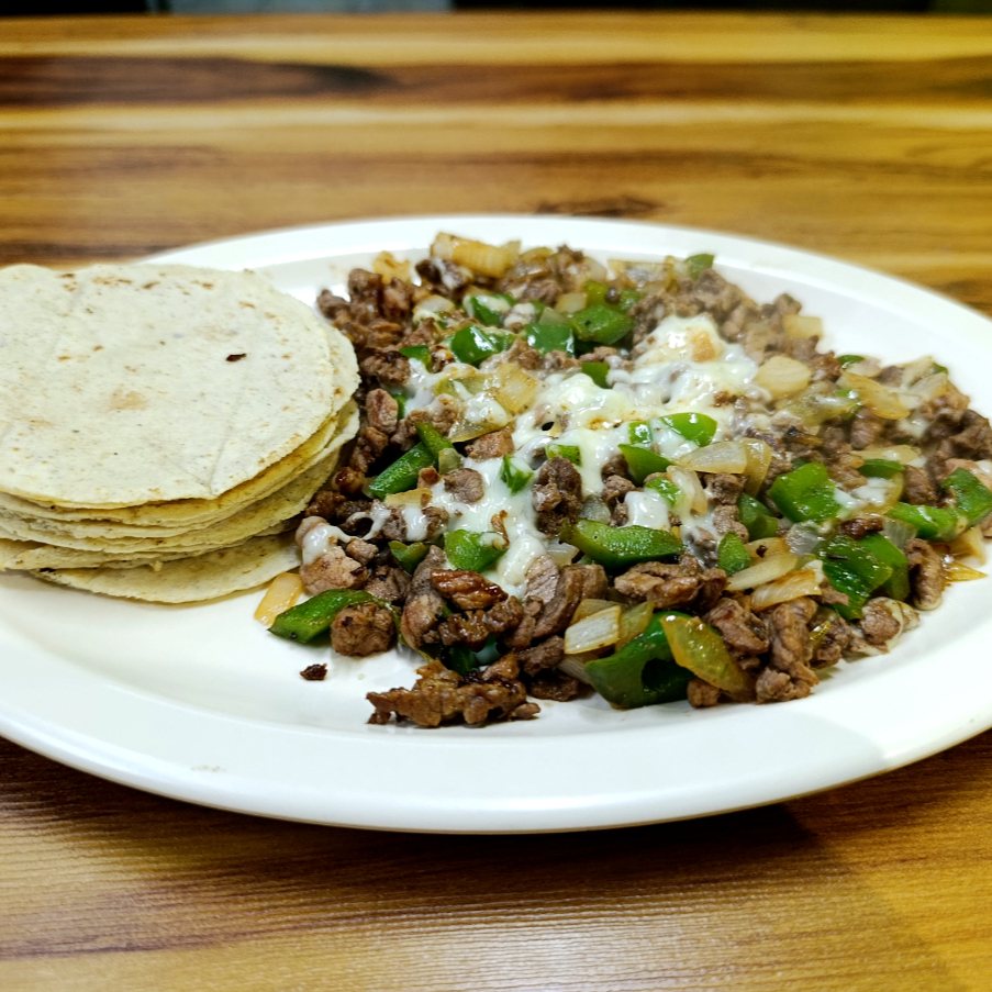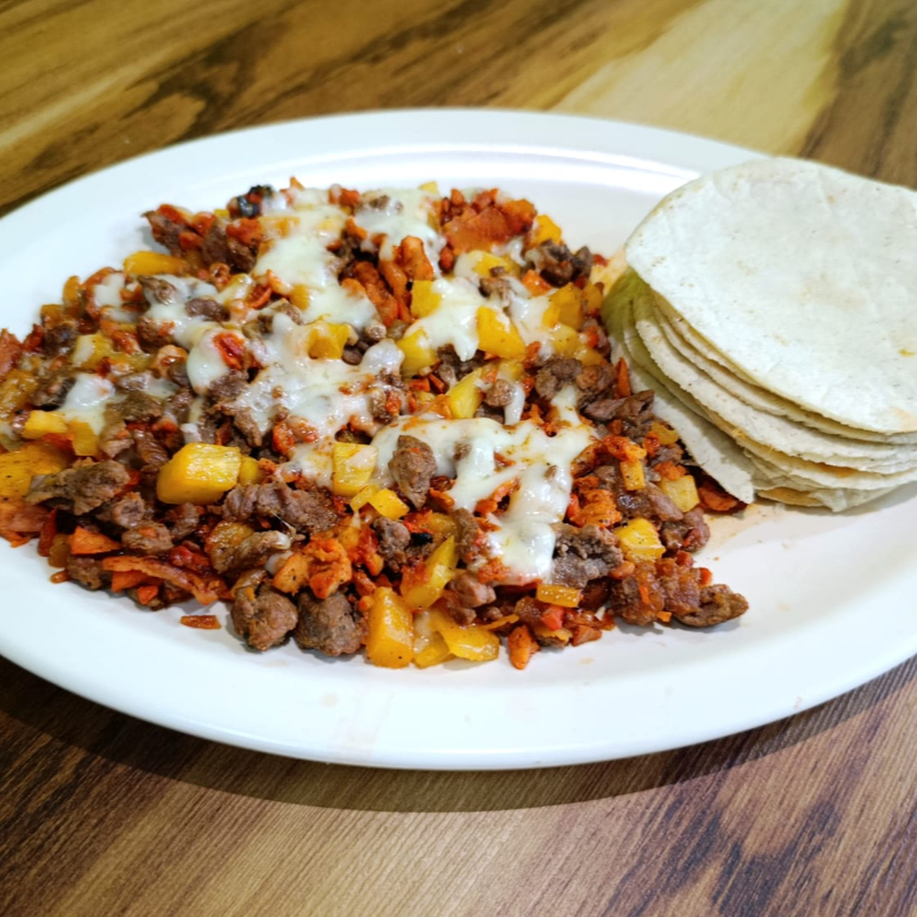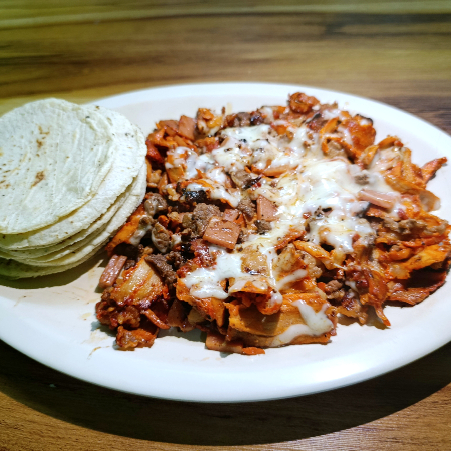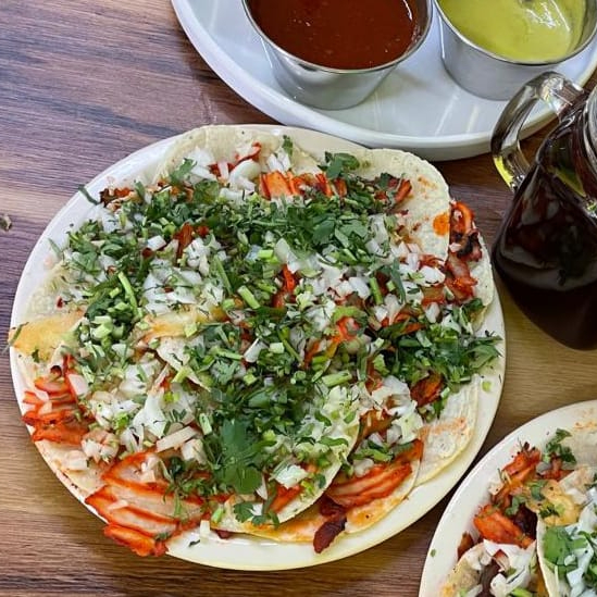 Cebolla, morrón, tocino, chuleta, Pastor, queso, 25 tortilla, 2 salsas