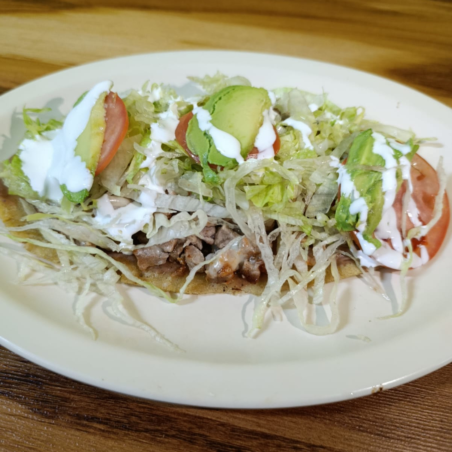 Sope de maíz con frijol refrito, carne de pastor, queso, lechuga, crema,