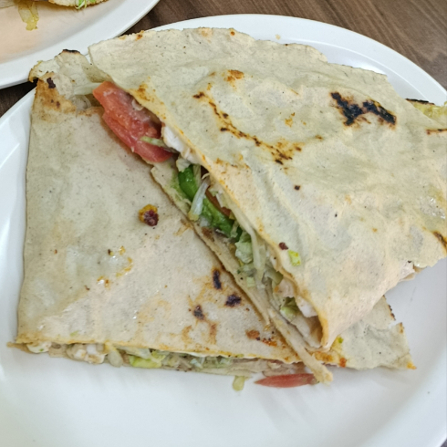 Tortilla de maíz grande 30cm con: asiento, frijoles refritos, carne de arrachera picada, queso, lechuga, jitomate y aguacate