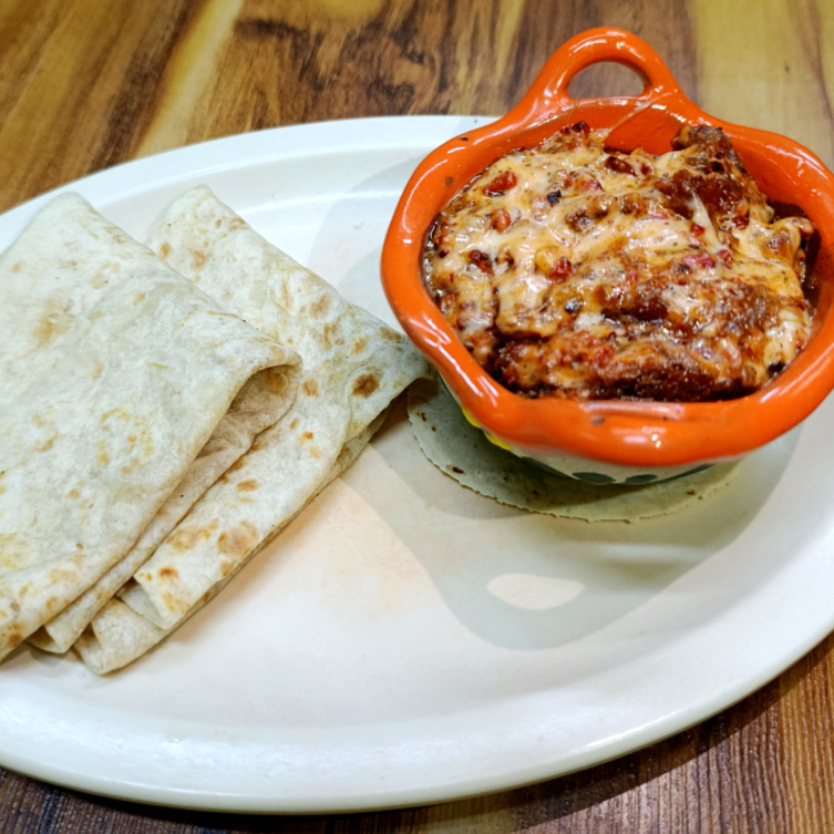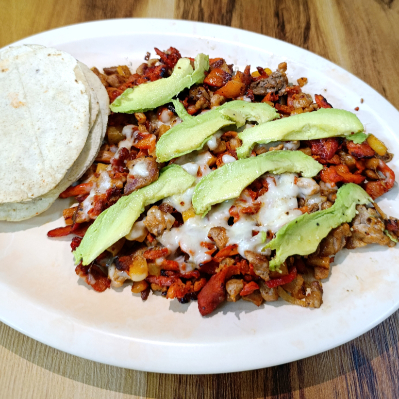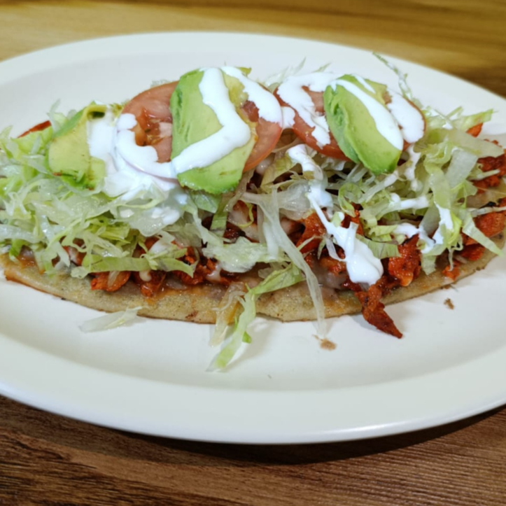 Tortilla de maíz grande 29 cm con asiento,frijol refrito,carne al pastor, queso, lechuga, jitomate, aguacate