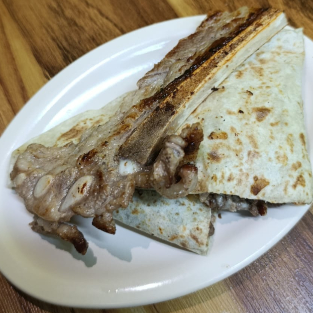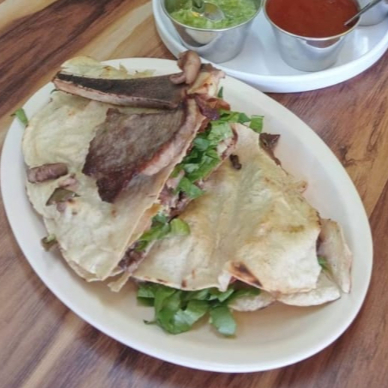Tortilla de maíz grande 29 cm con asiento,frijol refrito,carne de costilla, queso, lechuga, jitomate, aguacate