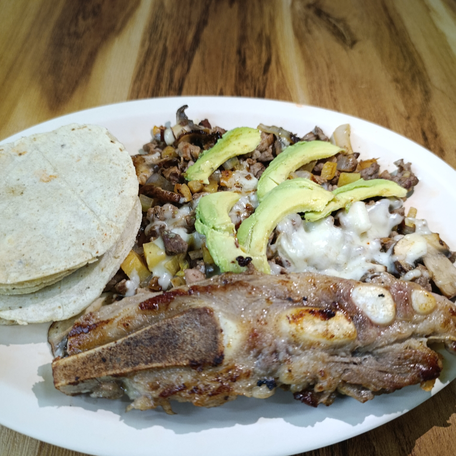 Costilla, cebolla, champiñones, piña, aguacate y queso