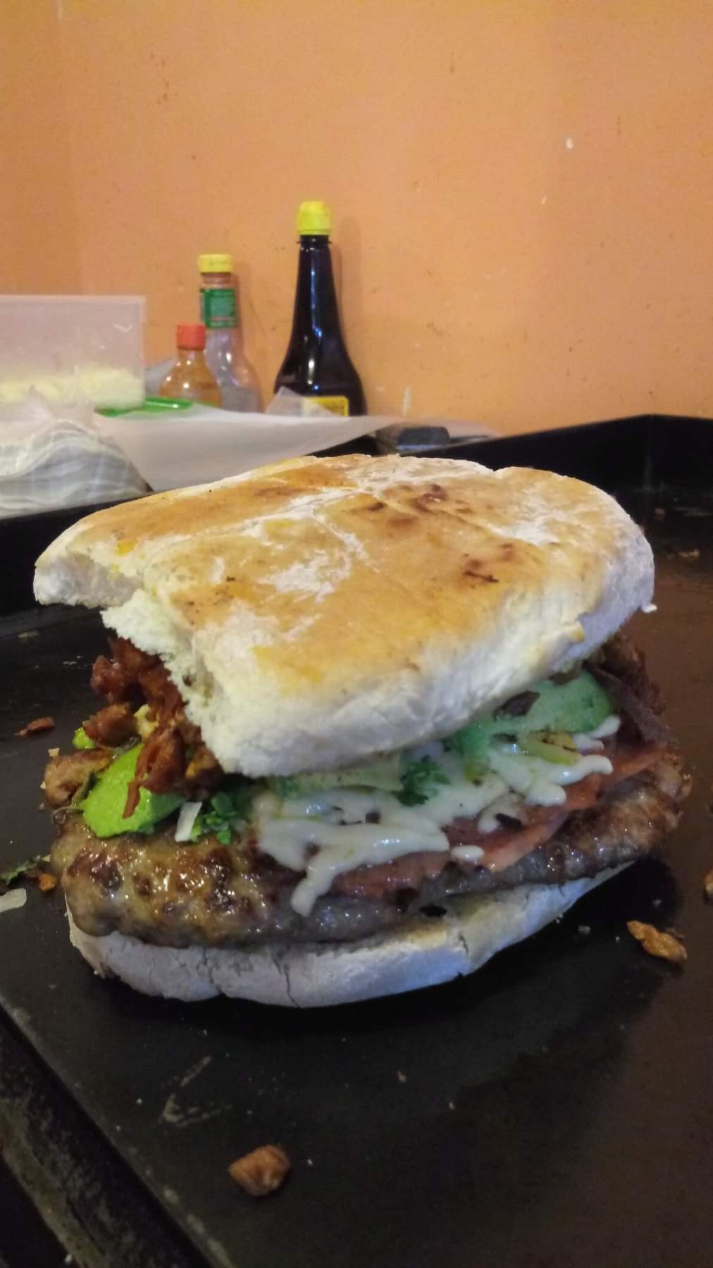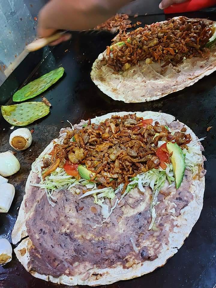 Tlayuda con frijoles, carne, queso, verduras + 1 guarnición de ensalada.