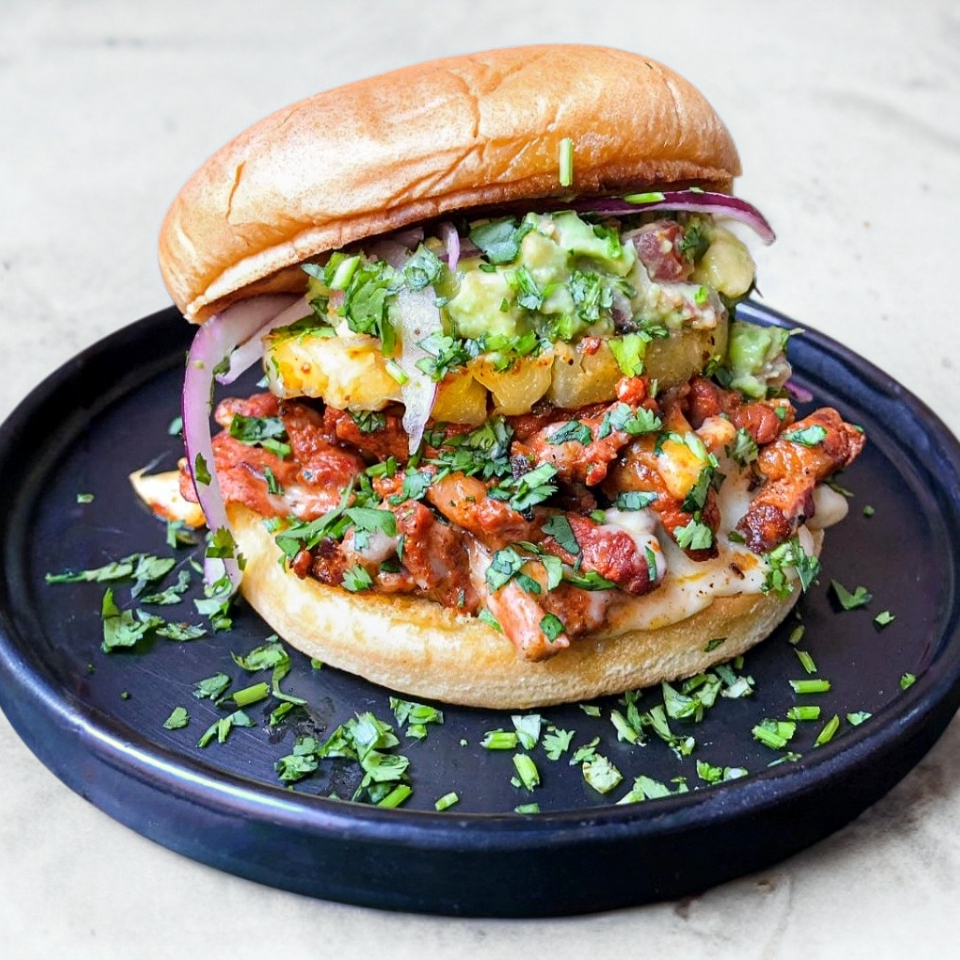 Carne de hamburguesa, pastor, piña, queso asadero, queso amarillo, lechuga, tomate, cebolla, mostaza, catsup y mayonesa