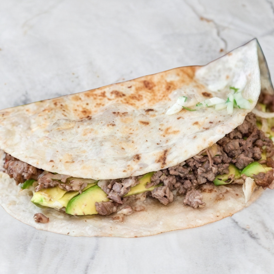 Quesadilla con tortilla echa a mano , rellena de carne al pastor