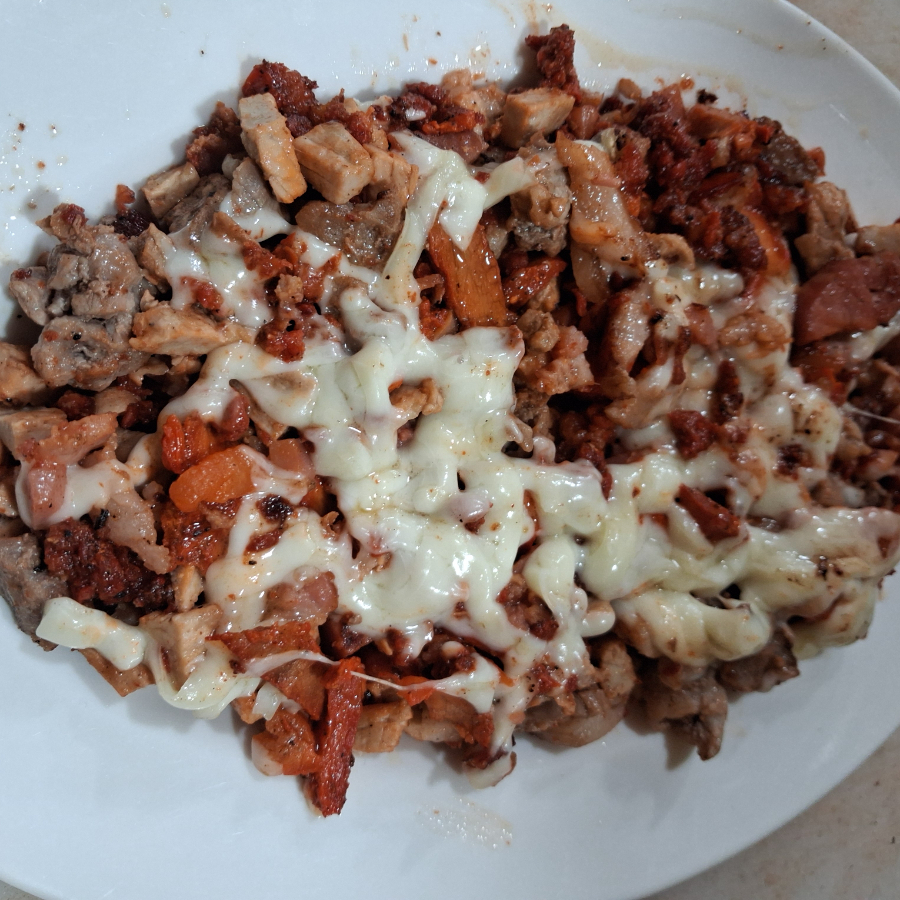 Carne al pastor con cebolla, morrón, queso y tocino