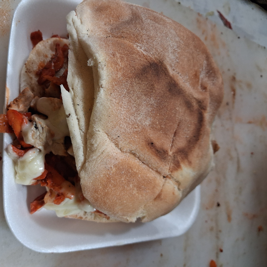 una torta de al pastor con queso (lleva jitomate, cebolla, aguacate y mayonesa)
