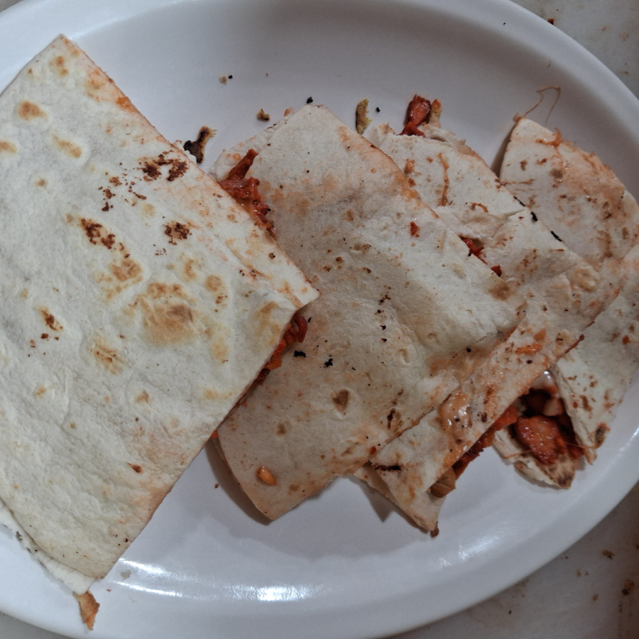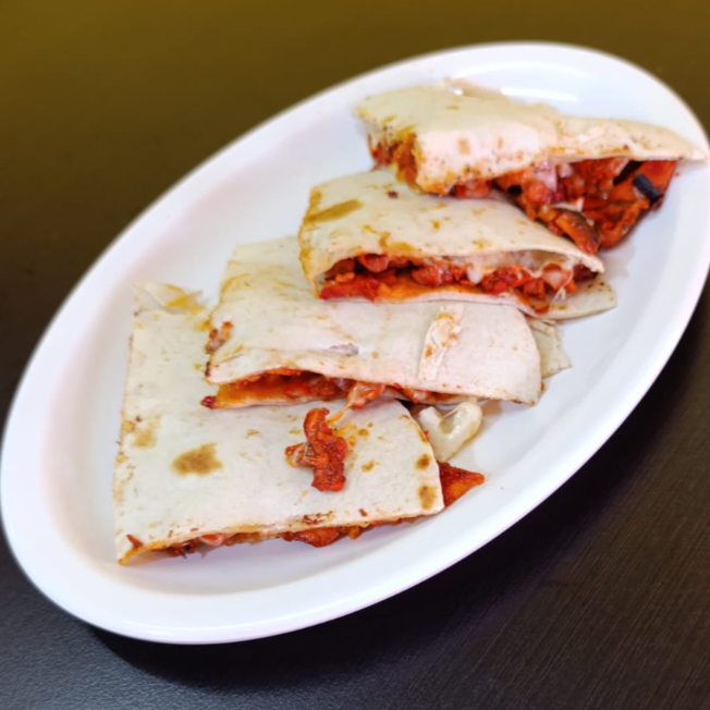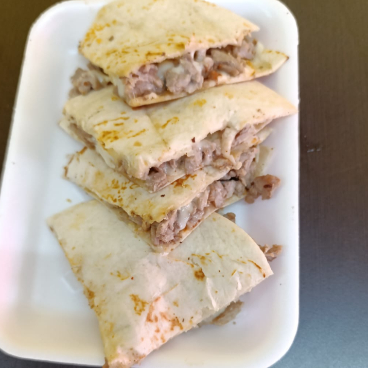 costra de queso con carne de al pastor en tortilla de harina