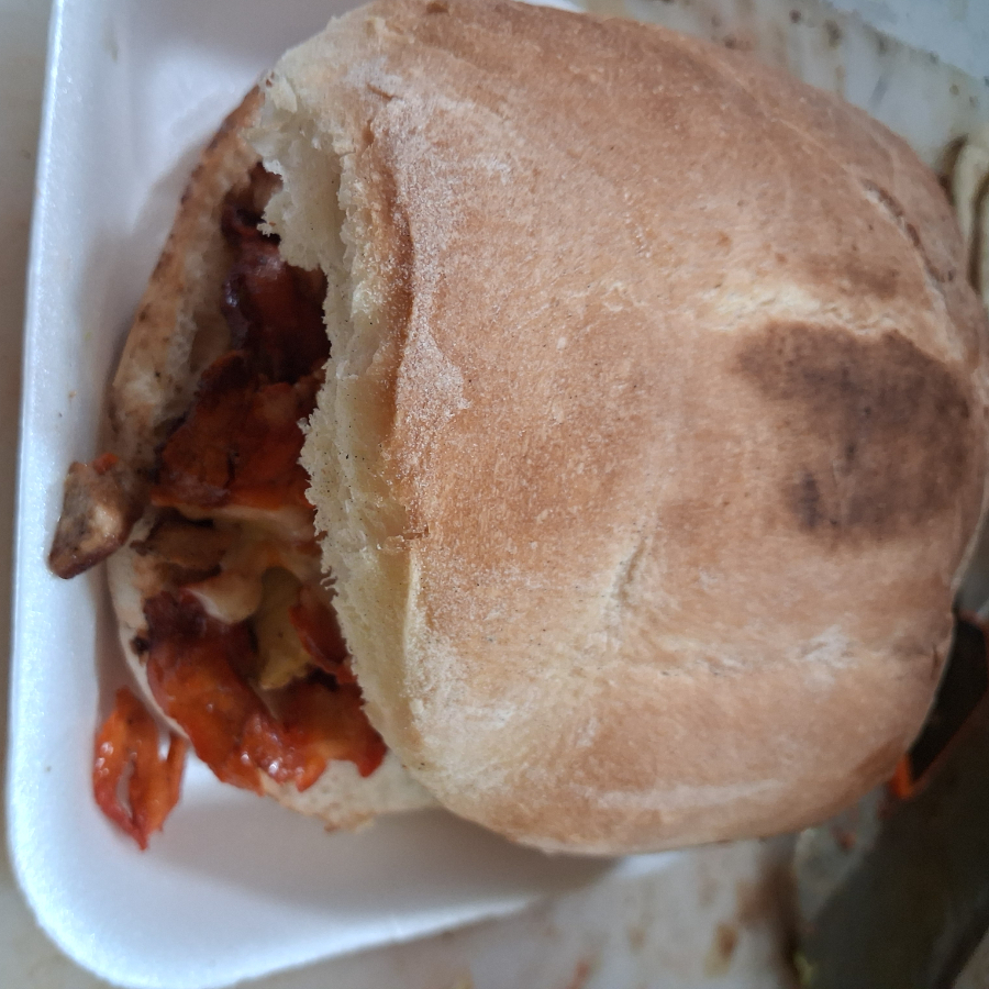 Carne de bistec con cebolla, morrón, queso y tocino