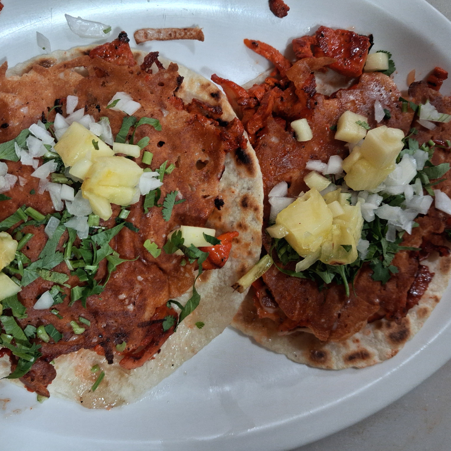 UN TACO DE AL PASTOR CON QUESO EN TORTILLA DE MAÌZ CON CEBOLLA, CILANTRO Y PIÑA