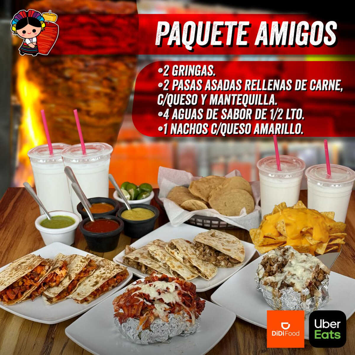 2 Gringas, 2 Papas asadas rellenas de carne, con queso y mantequilla, 4 aguas de sabo de 1/2 lt y nacos con queso amarillo