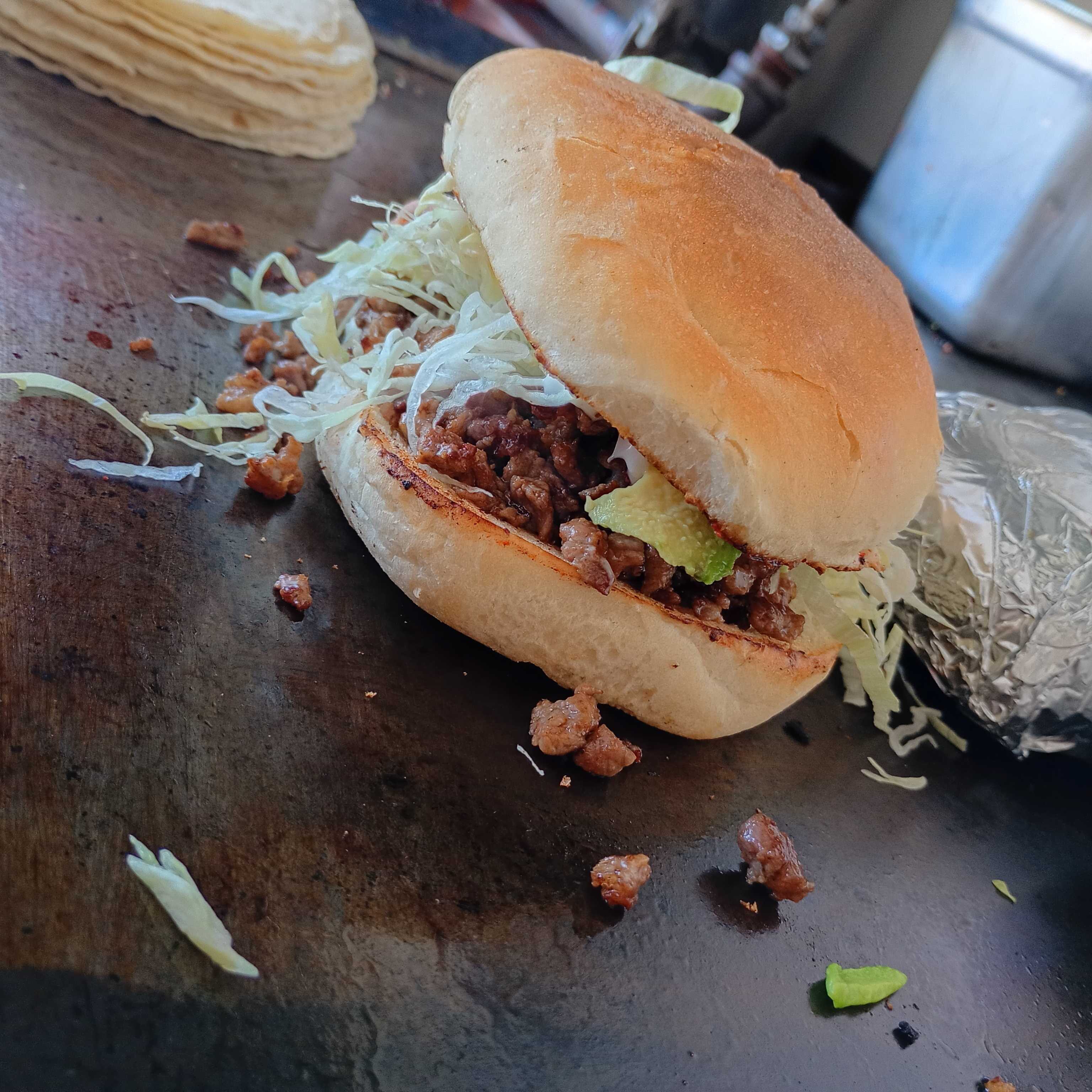 Pastor, lechuga, tomate, aguacate, mayonesa y queso