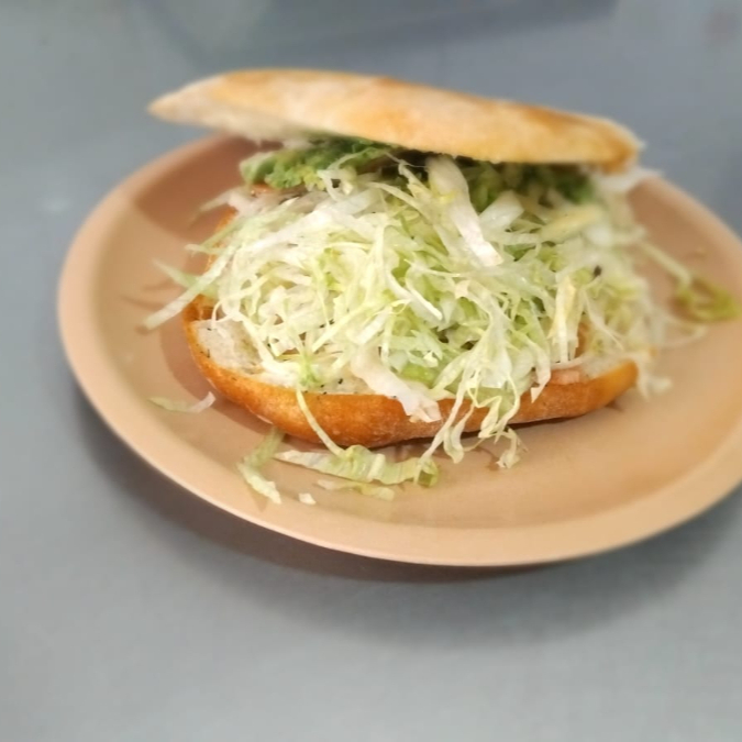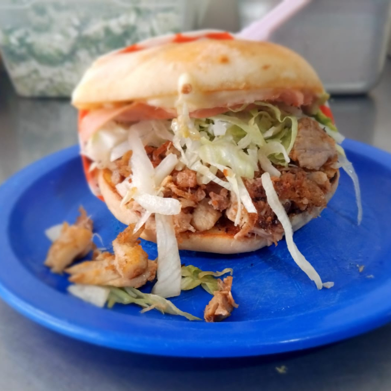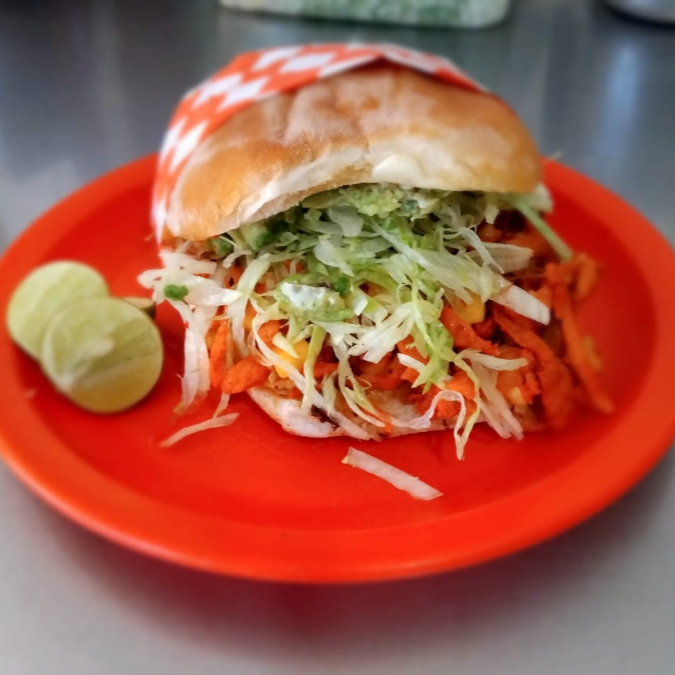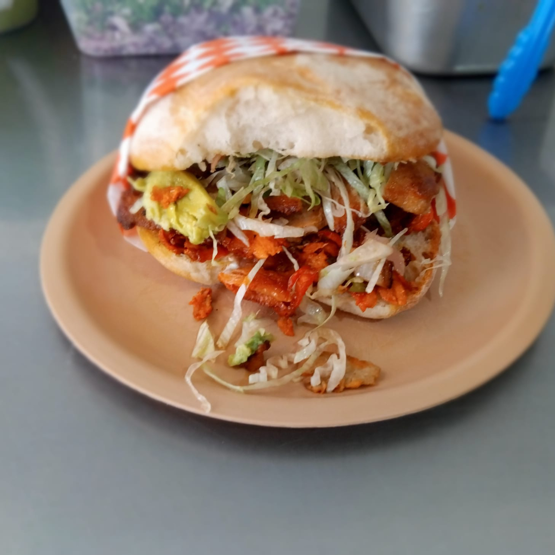 Una torta de carne al pastor con jamon, queso, lechuga, aguacate y mayonesa, salsa aparte