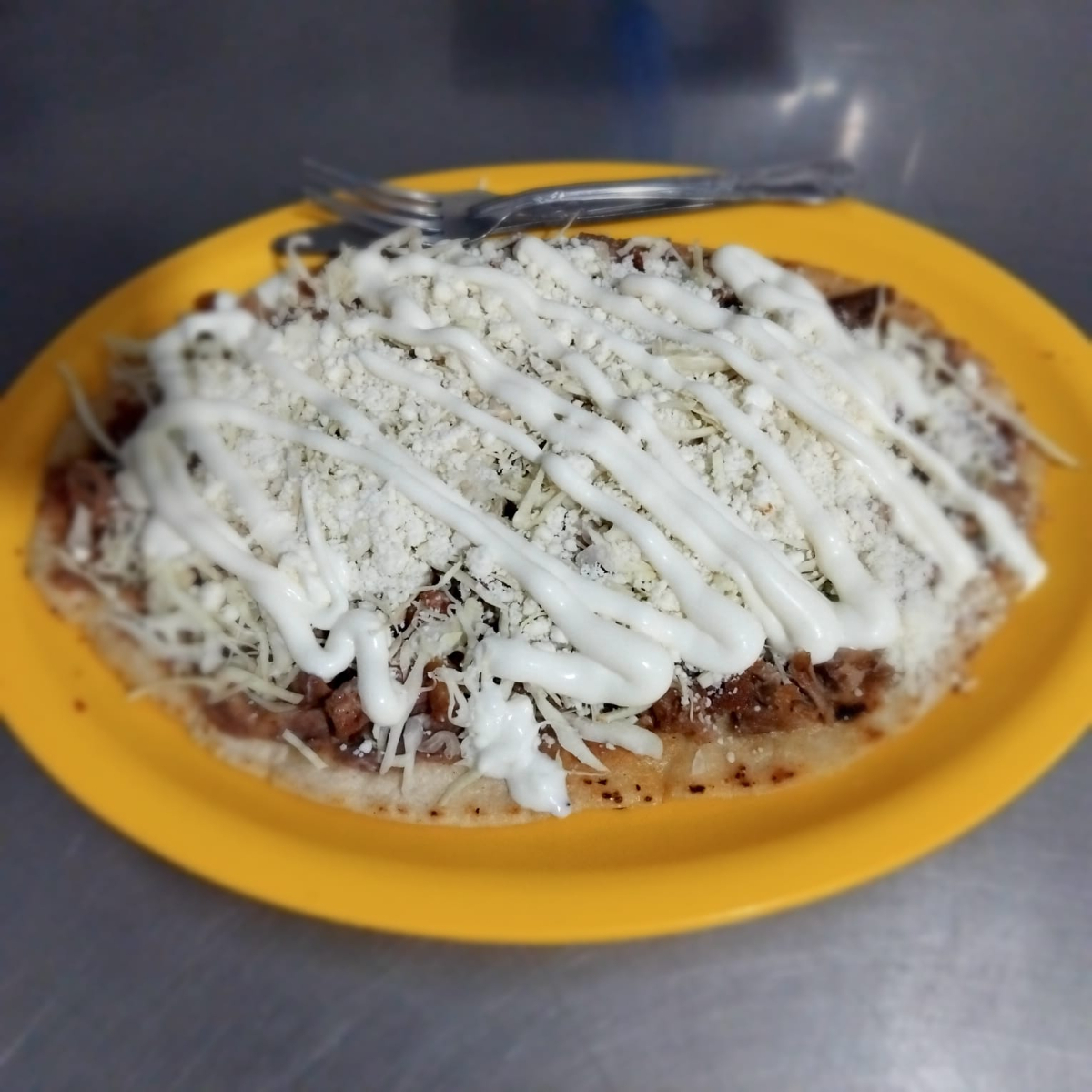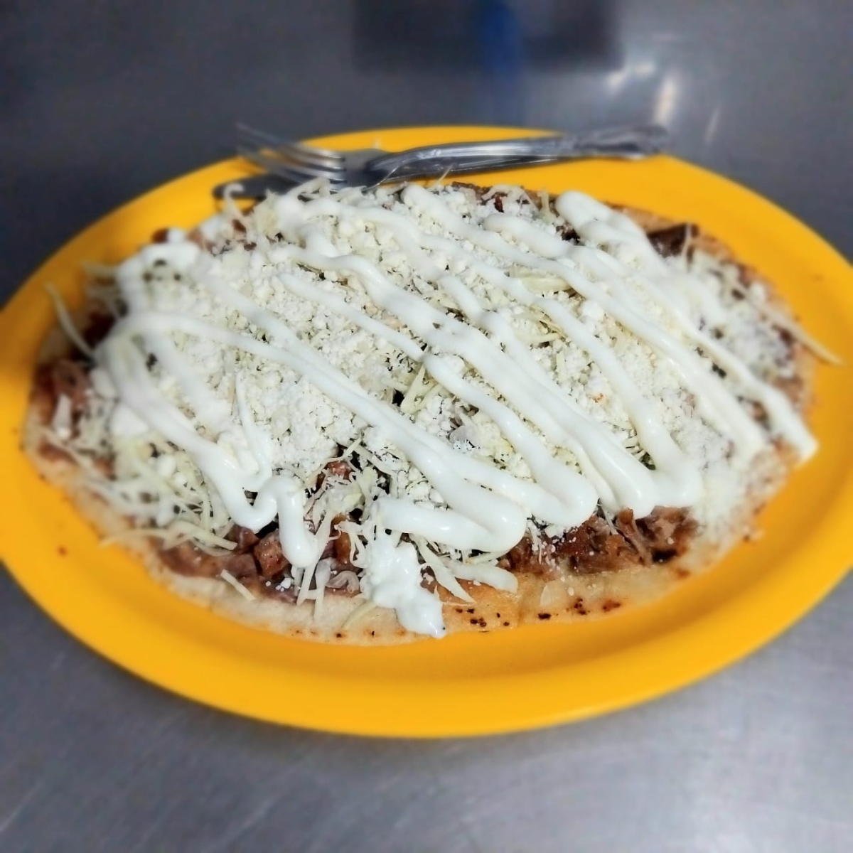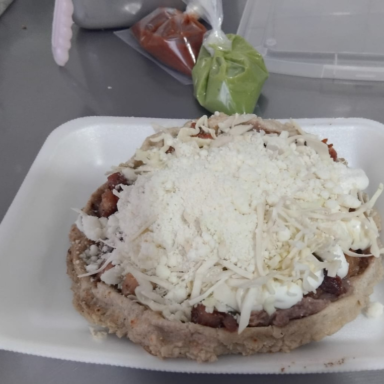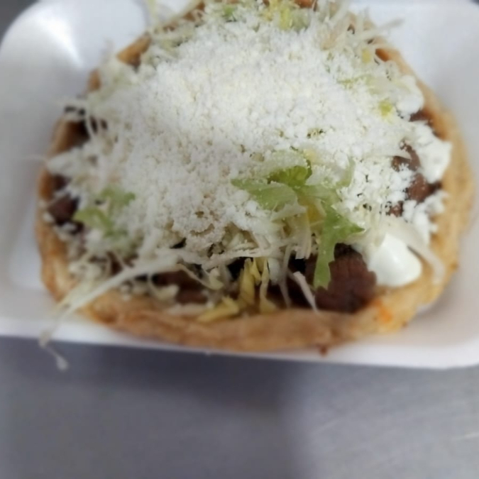 Base de Maiz con frijoles, carne de bistec, repollo, queso y crema, salsas aparte.