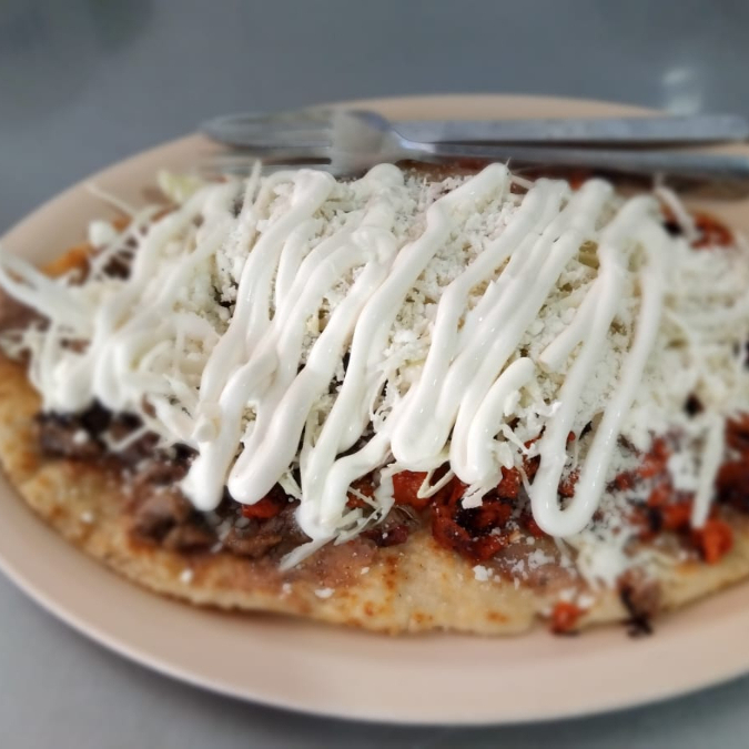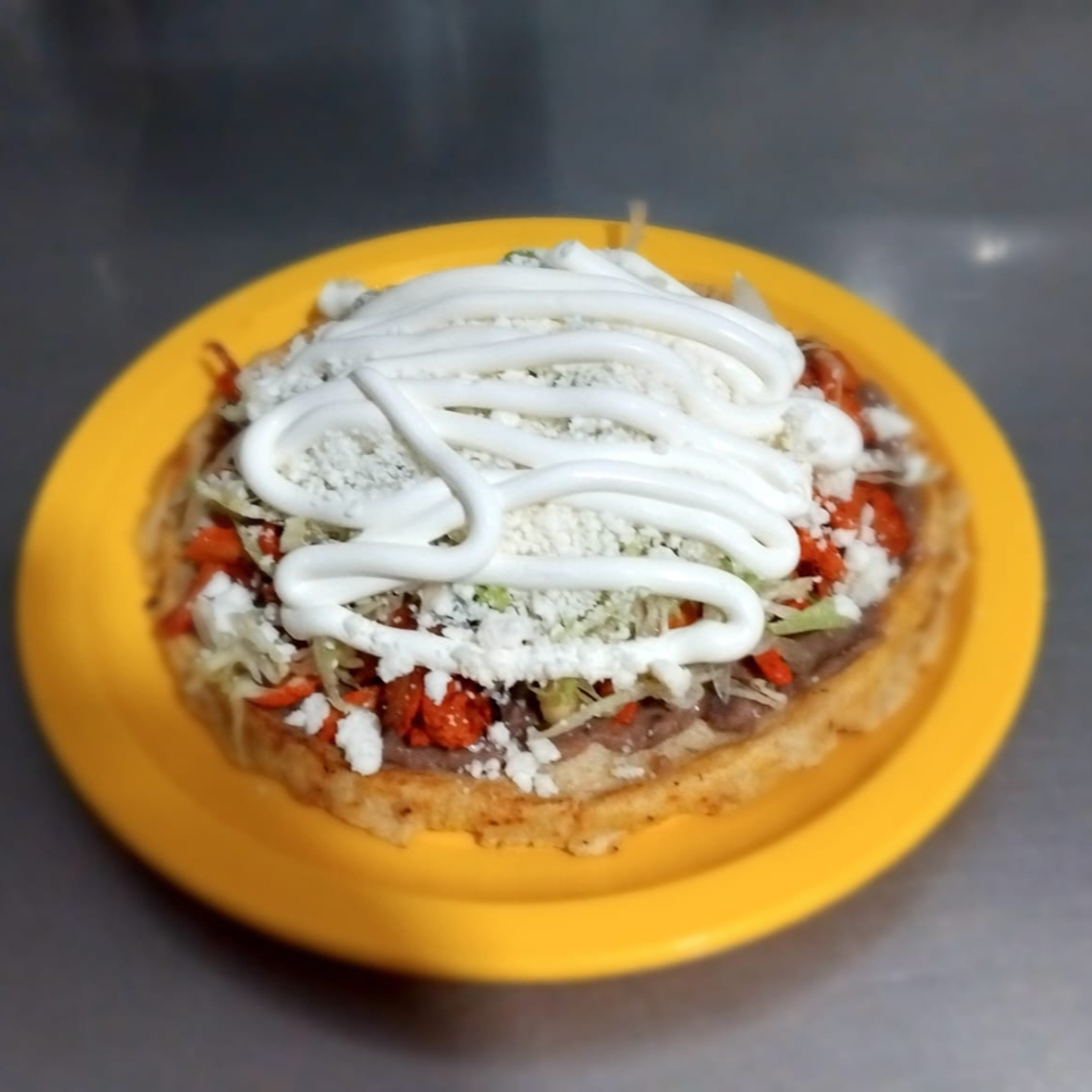 Base de tortilla de Maiz con frijoles, carne de bistec, repollo, queso y crema, salsas aparte.