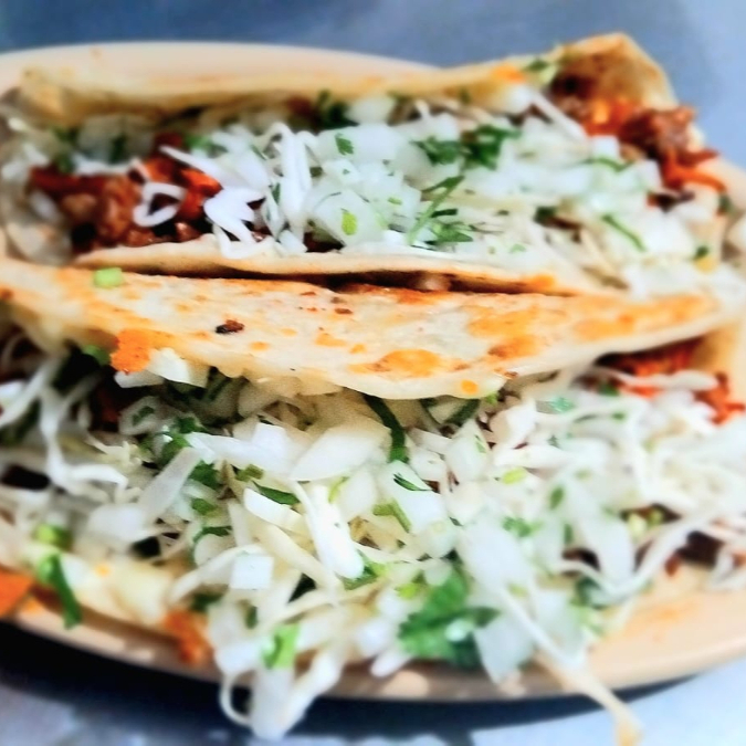 Dos tortillas de harina partidas en cuatro con suadero de res, queso y verdura, con salsas aparte.