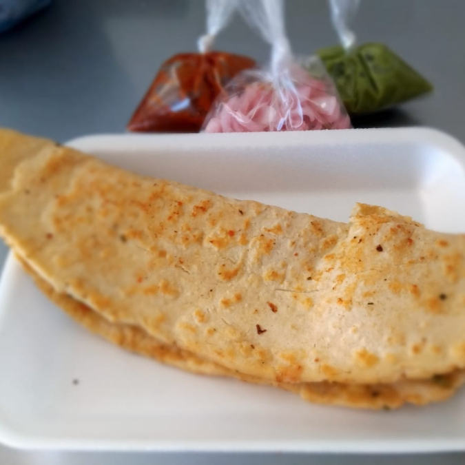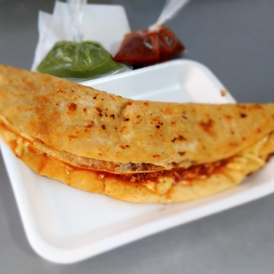 Una tortilla de Maiz doblada por la mitad con queso, salsas aparte.