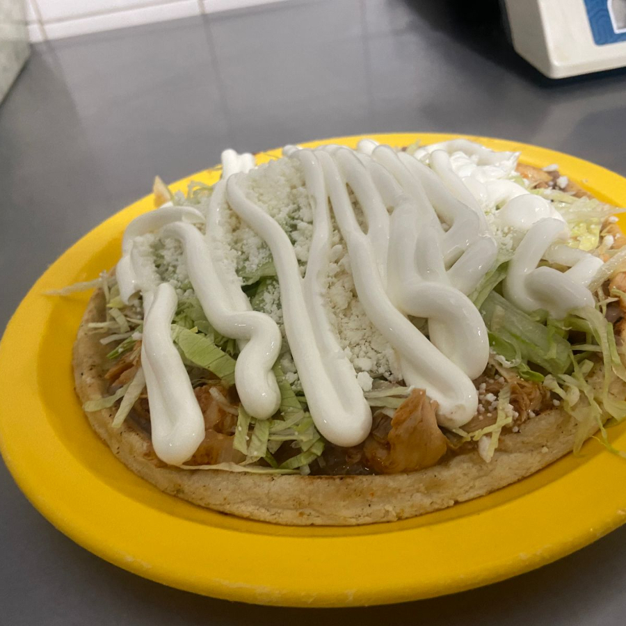 Base de Maiz con frijoles, Tinga de pollo, queso, crema y repollo.