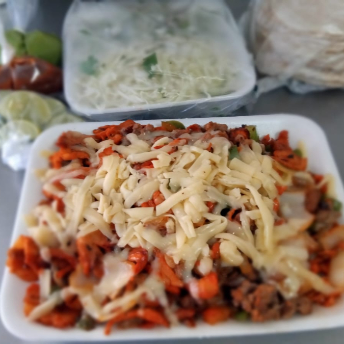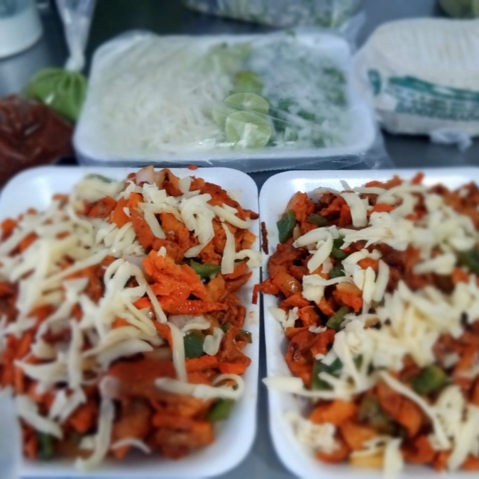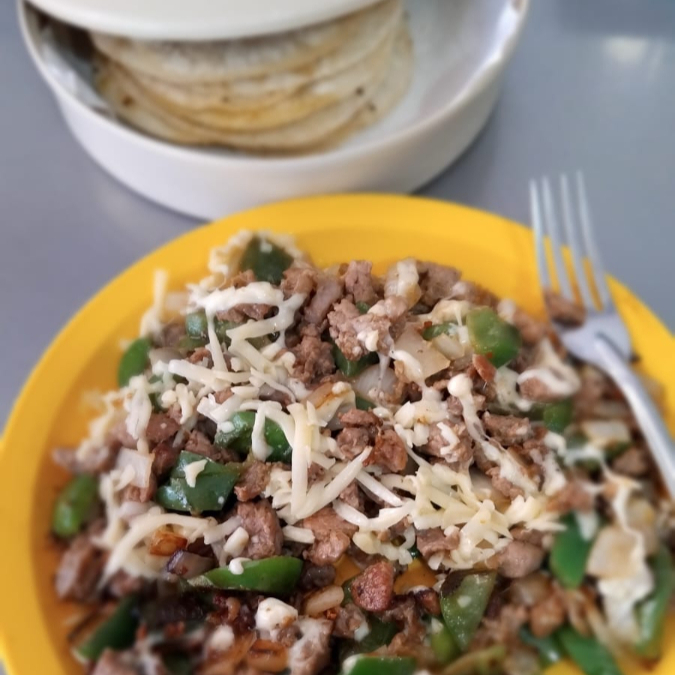 1/2kg de alambre de pastor y bistec (morron, queso, cebolla) con tortillas, verdura, salsas y limones aparte.