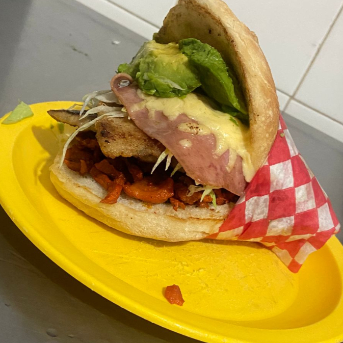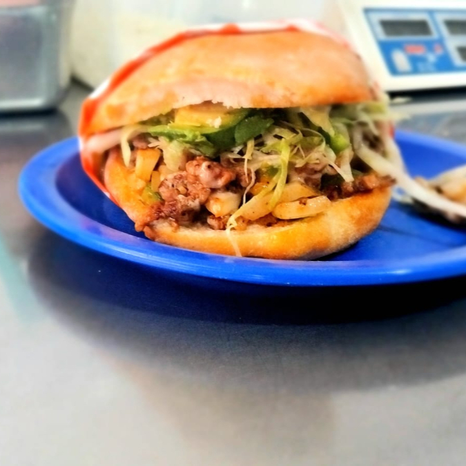 Una torta de carne de Bistec con jamon, queso, aguacate, lechuga y mayonesa.