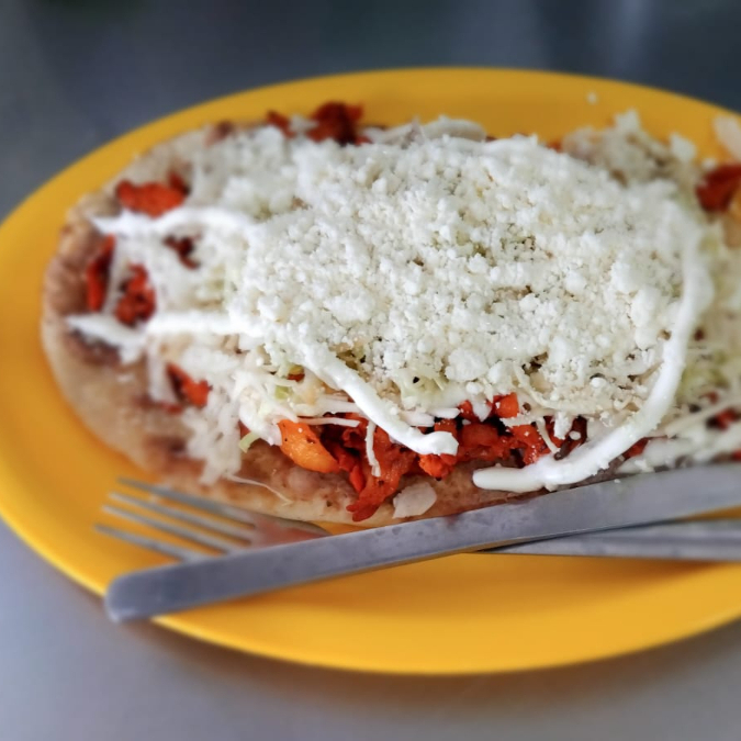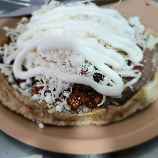 Base de Maiz con frijoles, chicharron prensado, repollo, queso y crema.