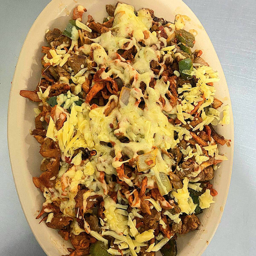 Base de maiz con frijoles, carne de pastor y bistec, repollo, queso y crema, salsas aparte.