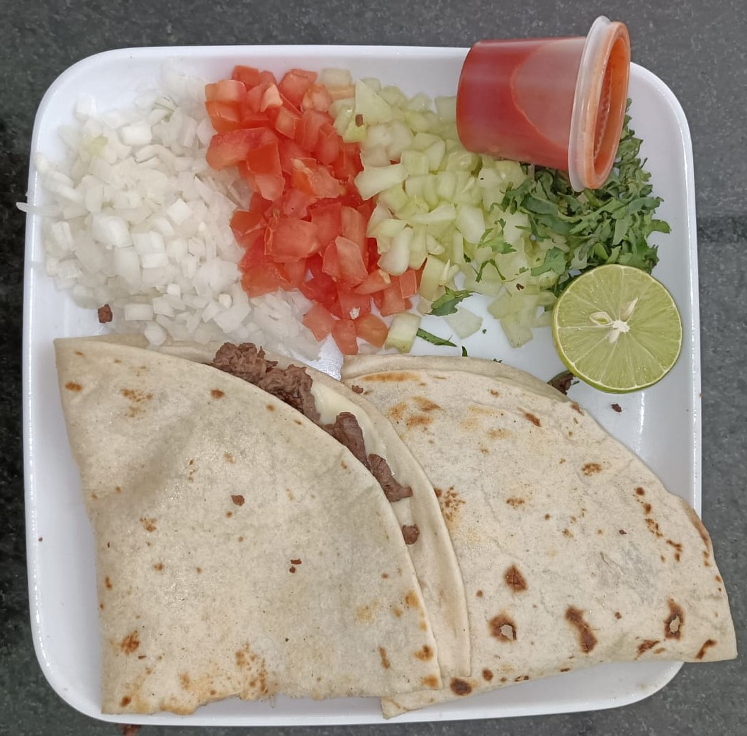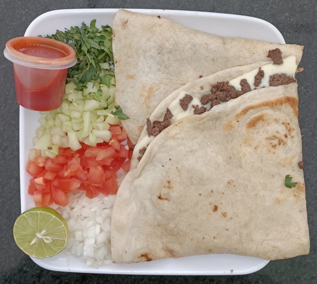 Tortilla de harina, acompañado de tomate, cebolla, cilantro, pepino, limón y salsa.
