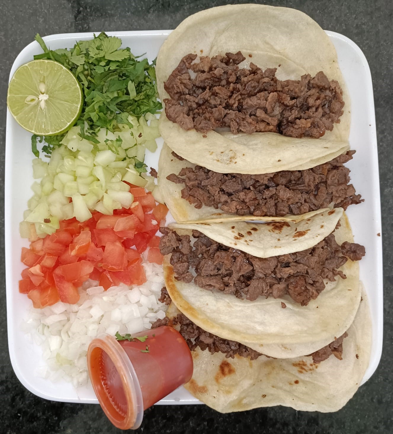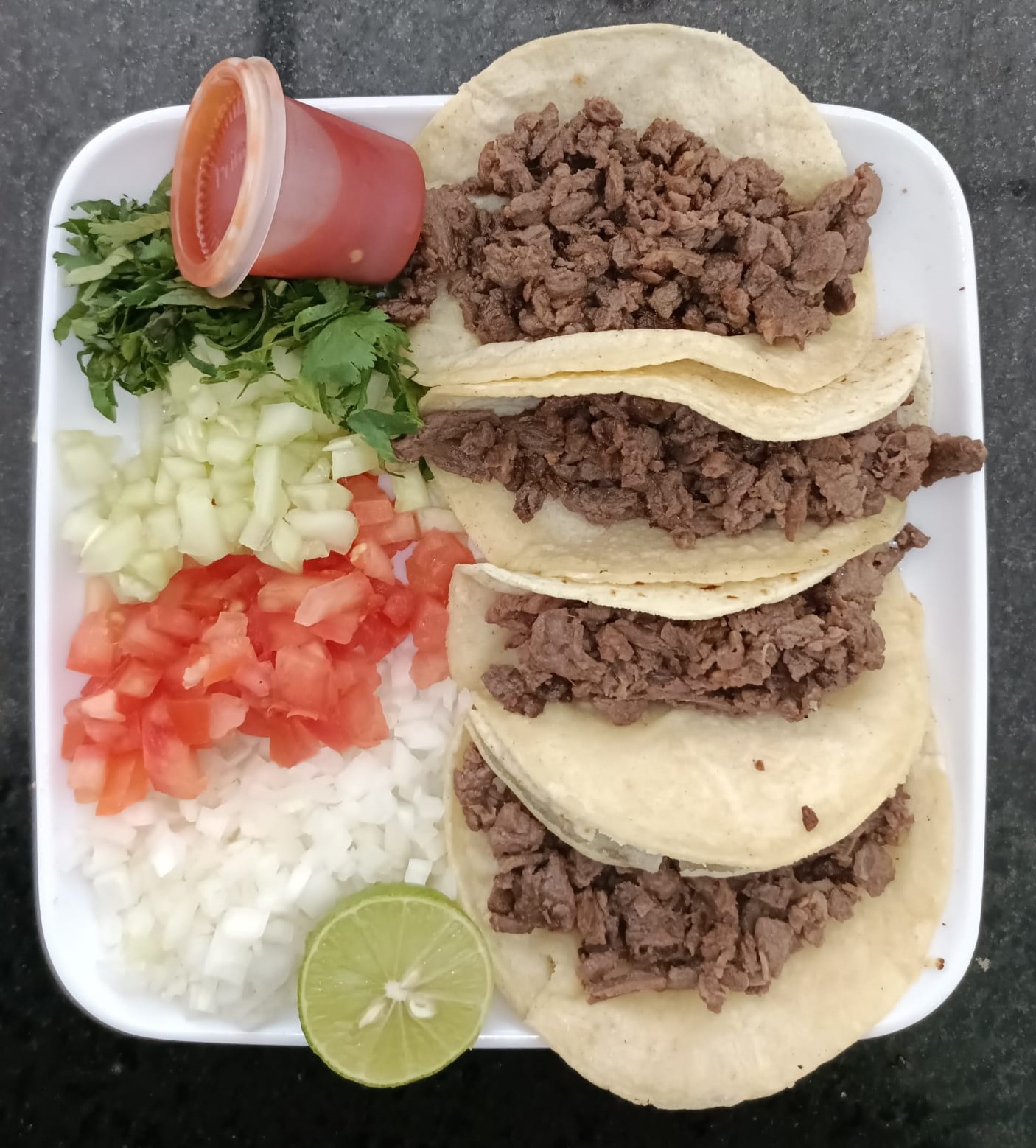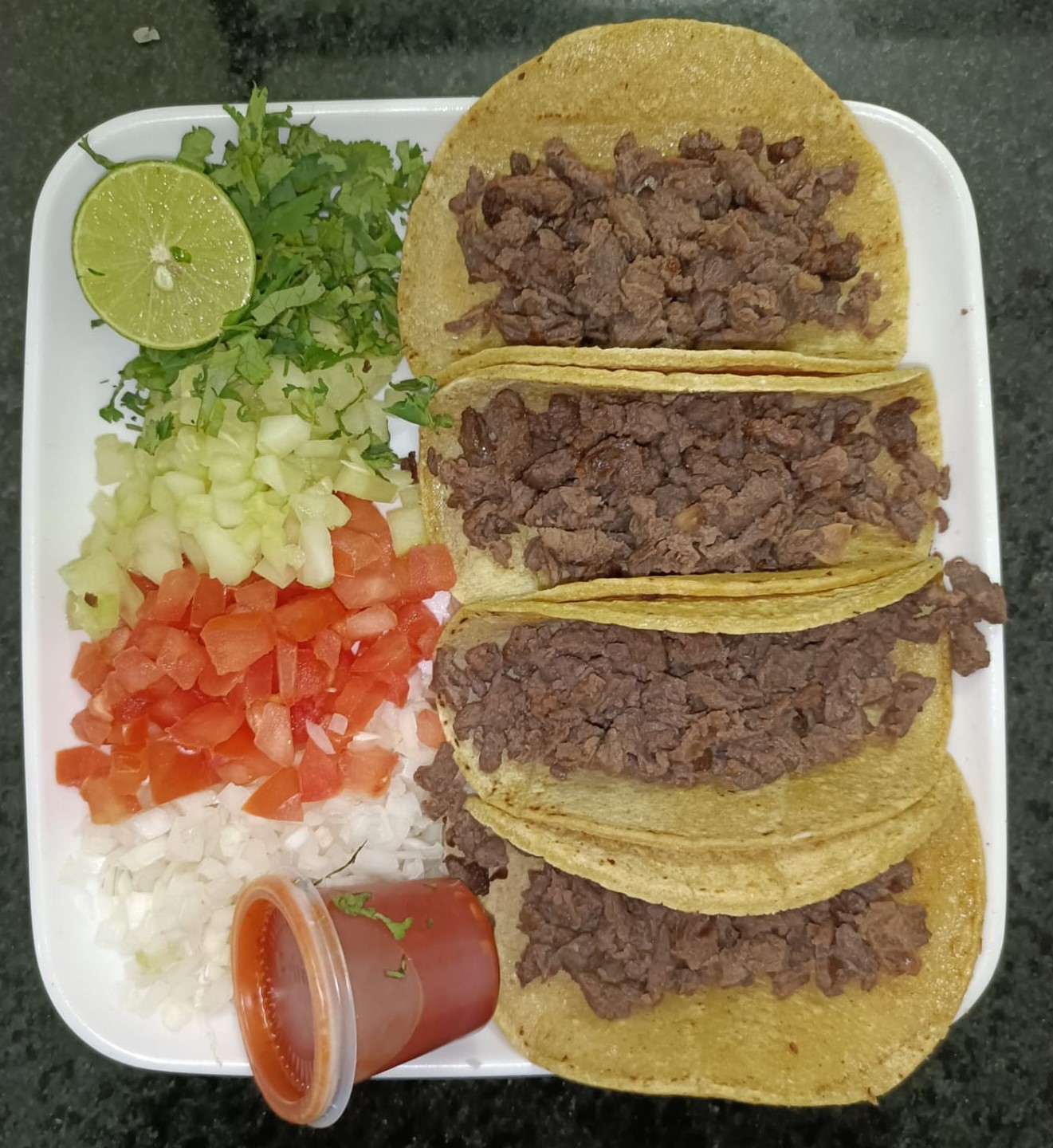 Carne de viste, Tortilla taquera de nixtamal, acompañada de tomate, cebolla, cilantro, pepino, limón y salsa.