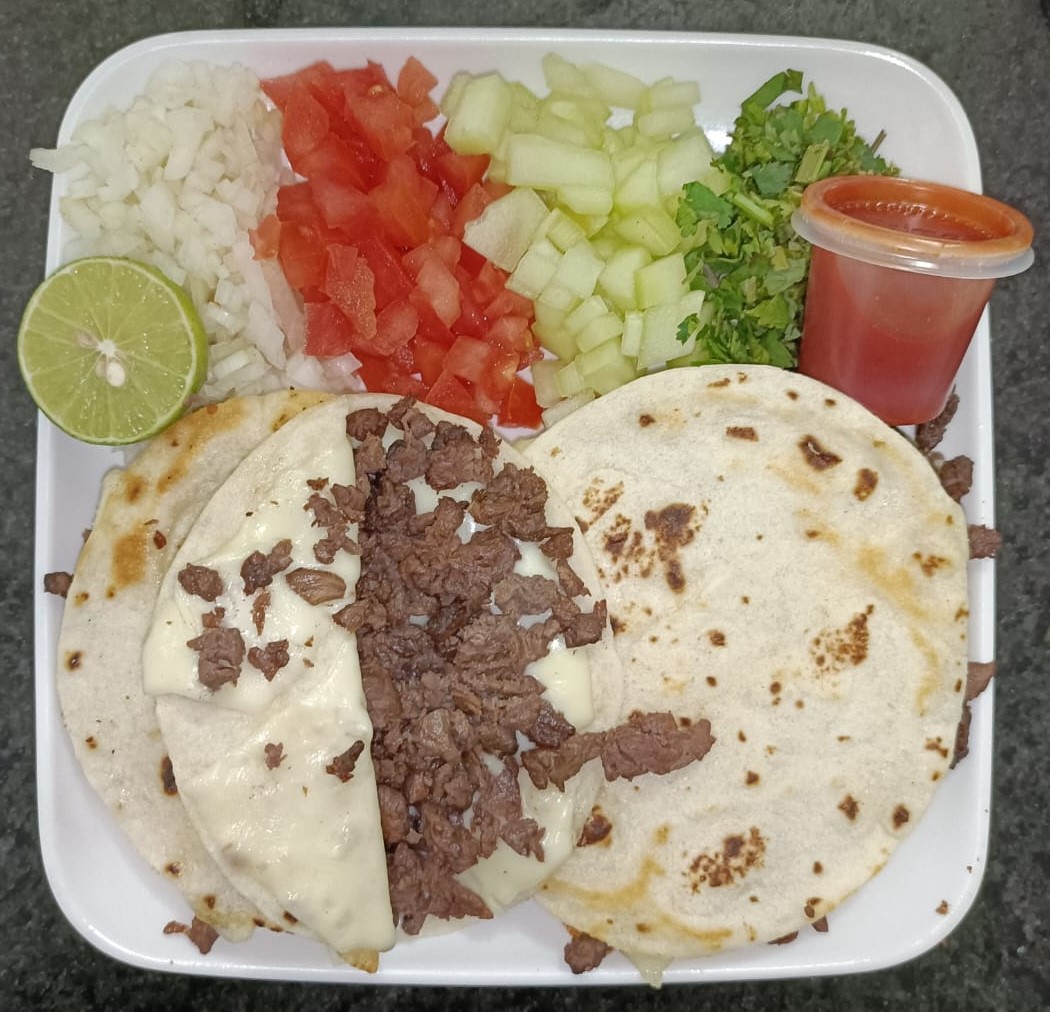 Quesi Tacos) tortilla de maíz con bistec y asadero, cebolla, tomate, pepino, cilantro, limón y salsa