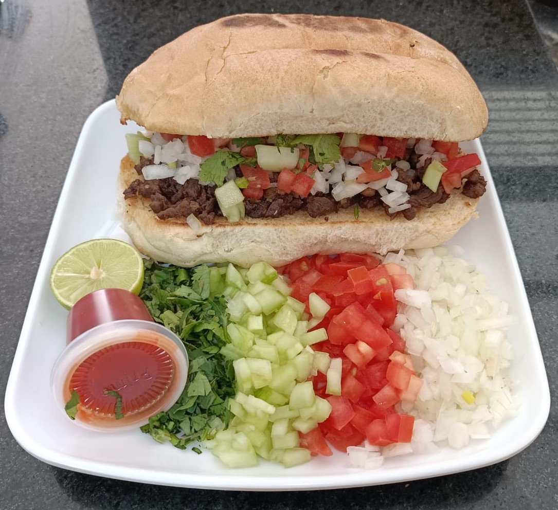 Pan blanco Carne de Bistec y Asadero, acompañado de tomate, cebolla, cilantro, pepino, limón y salsa.