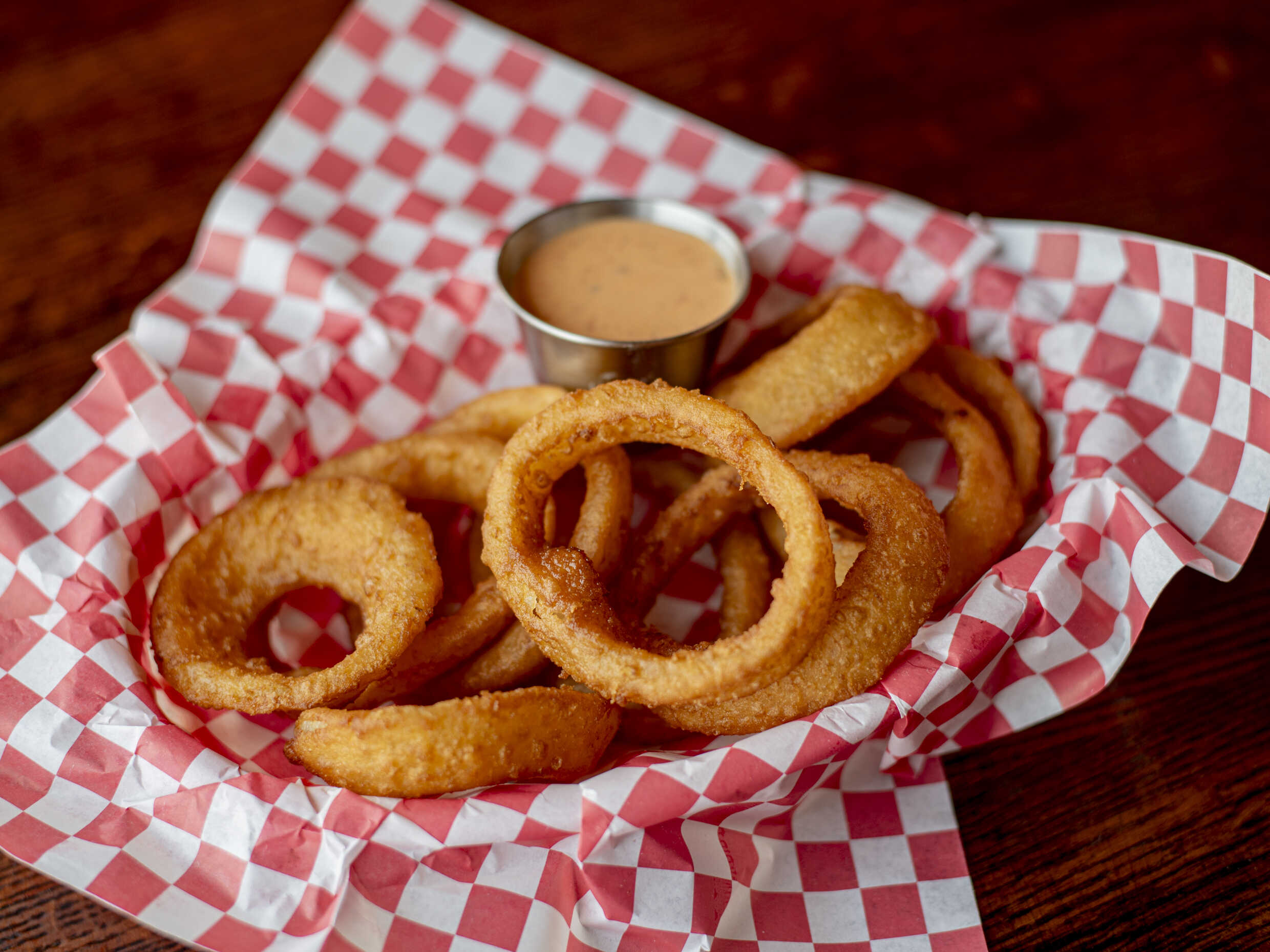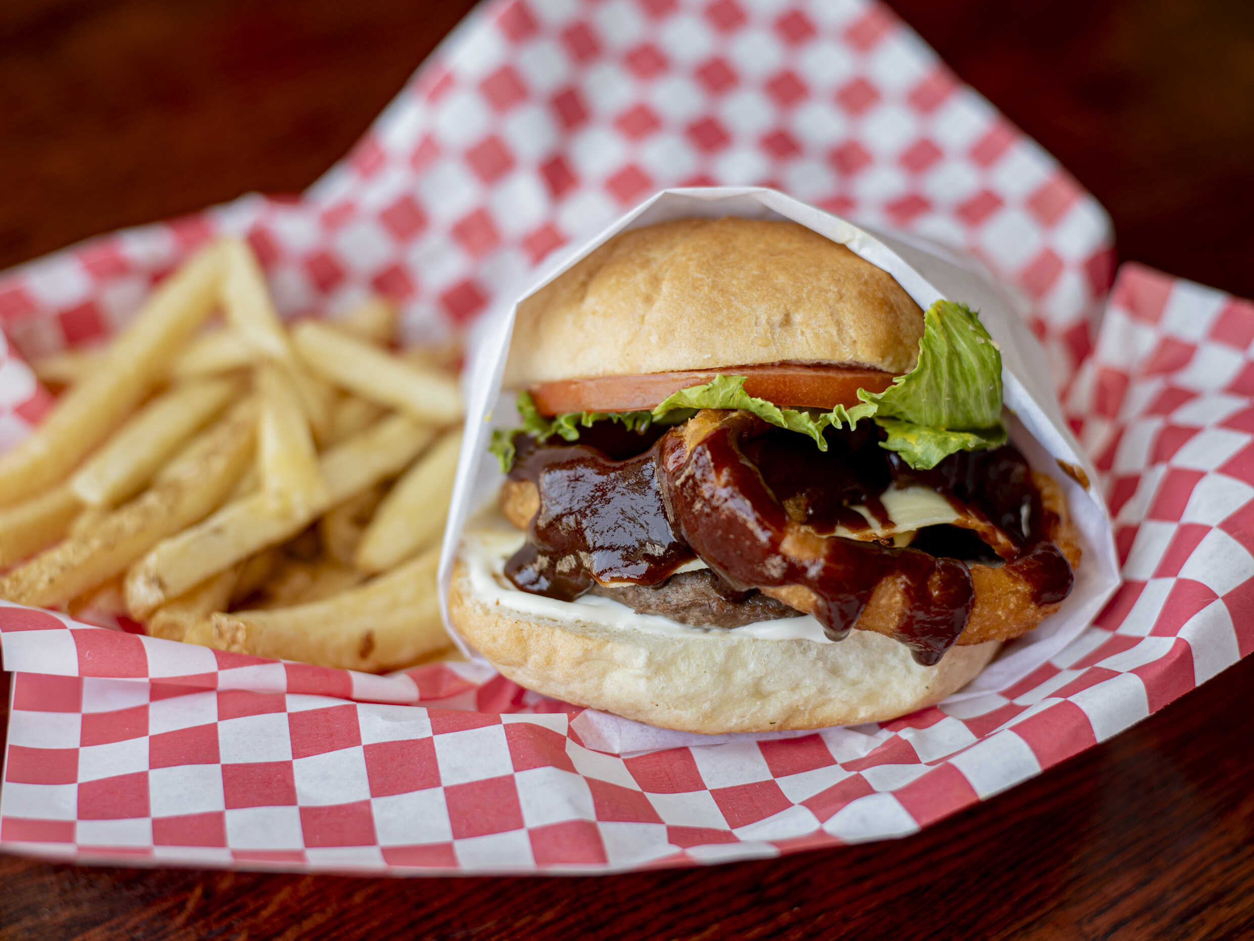 150g Carne de Sirloin,Aros de Cebolla bañados en salsa BBQ, Delicioso Pan Artesanal, Queso Menonita, Lechuga, tomate, aderezada con mayonesa y mostaza.