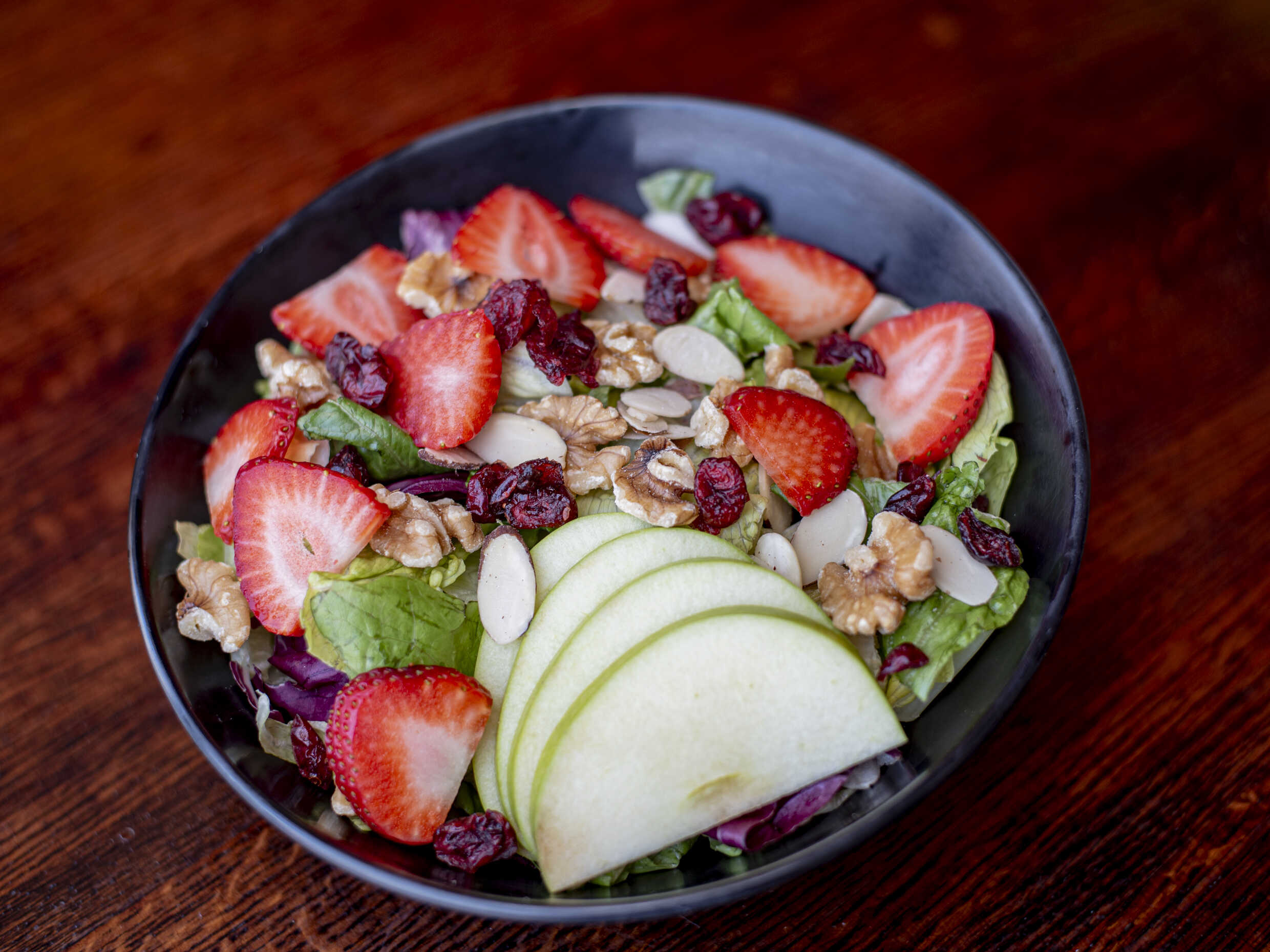 Mezcla de lechugas Orgánicas, manzana Chihuahuense, fresa natural, nueces de castilla, arándano y almendra rebanada . Incluye aderezo de honey mustard receta de casa 2oz.