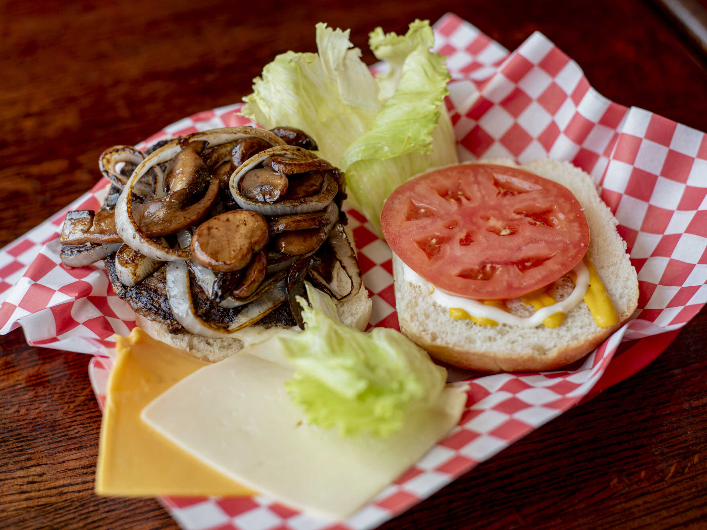 150g Carne de Sirloin,Cebolla Caramelizada , champiñones asados, Delicioso Pan Artesanal, Queso Menonita, Lechuga, tomate, aderezada con mayonesa y mostaza.