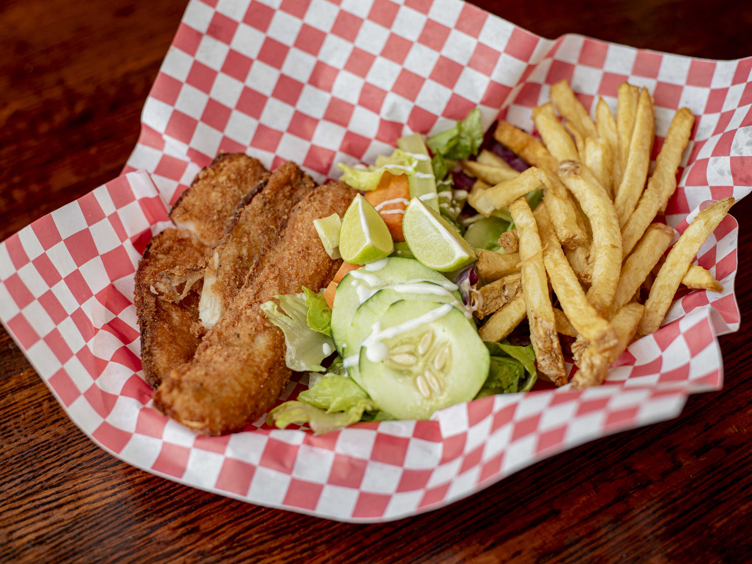 Delicioso Filete de mojarra empanizado, Fresca ensalada de lechugas organizas , apio, zanahoria, papas y agua fresca, ranch 2oz
