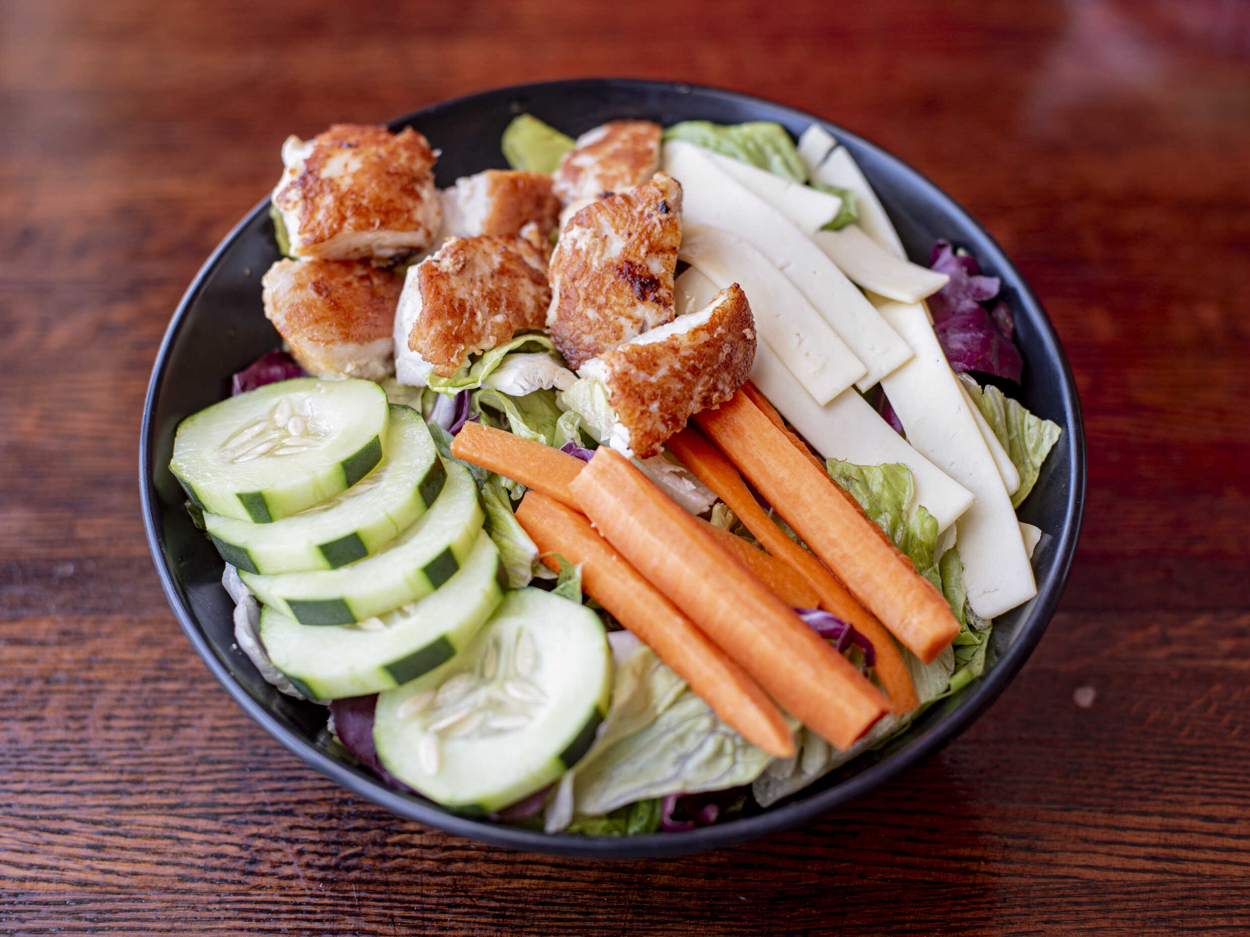 Fresca Mezcla de Lechugas Orgánicas, queso menonita rallado, pepino fresco, zanahoria rayada, pepitas de calabaza saladas, 120g de pollo a la plancha con aderezo parmesano de la casa