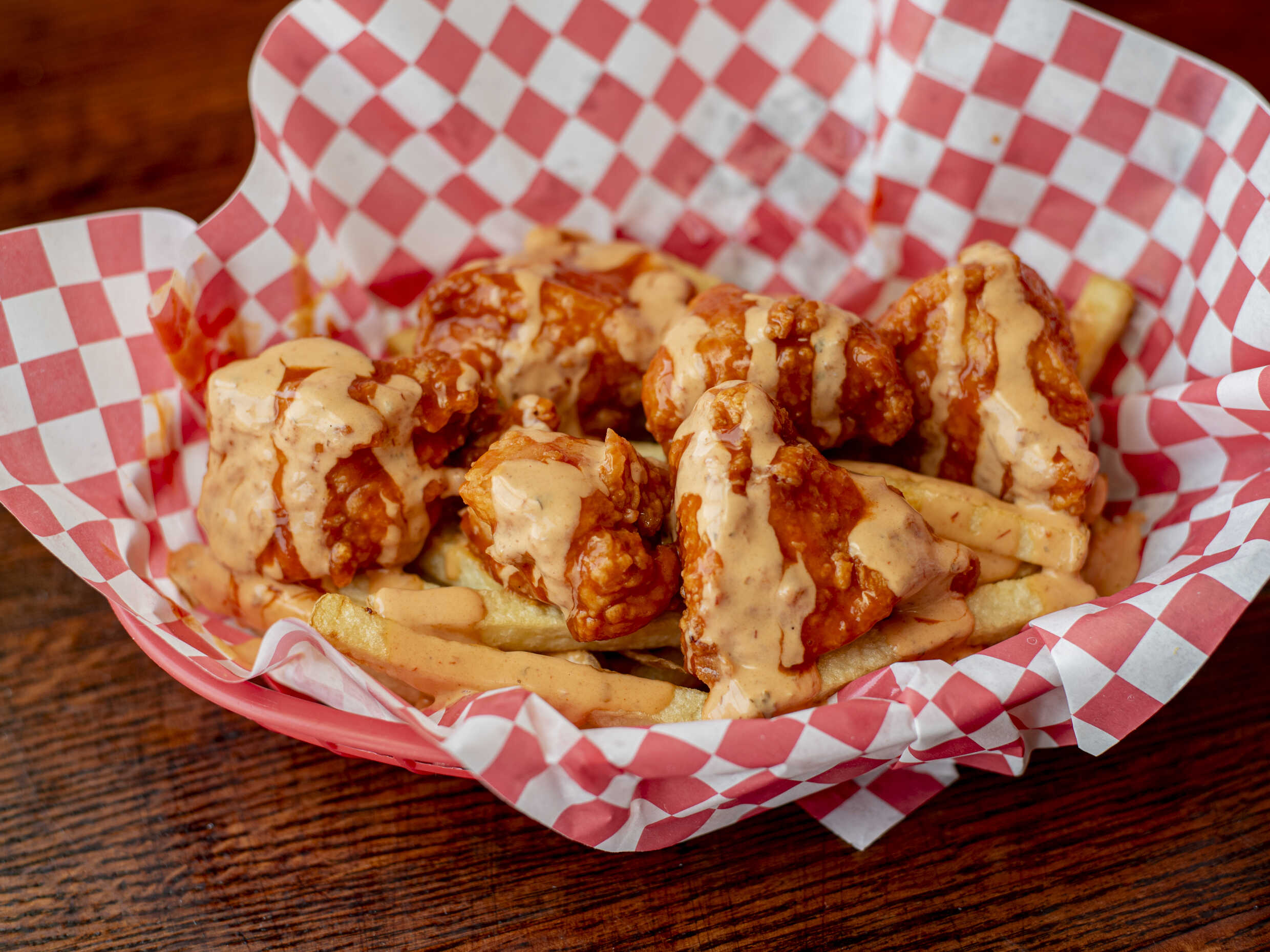12 Boneless Montados en una cama de papas 100% naturales, bañados en salsa Classic Búfalo y el delicioso aderezo de la casa.